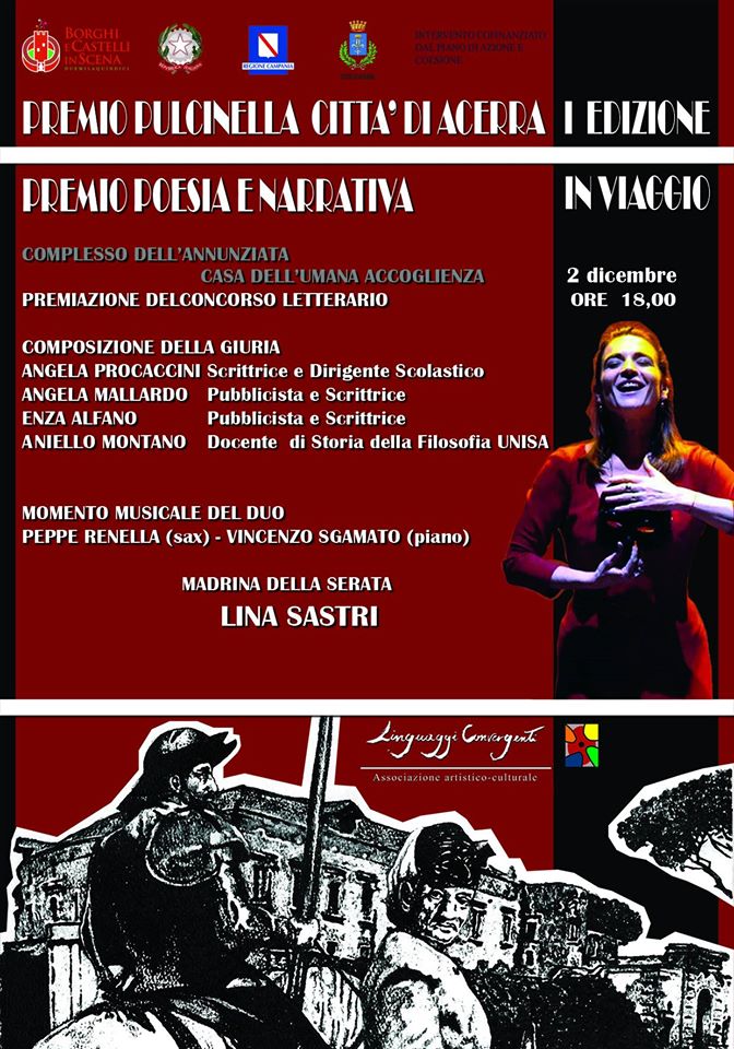 2 Dicembre ore 18 serata di premiazione del concorso letterario “PREMIO PULCINELLA città di ACERRA”, con la presenza in qualità di madrina di Lina Sastri e con il duo Renella-Sgamato (Sax e piano) nelle sale del convento “Casa dell’umana accoglienza” Acerra.