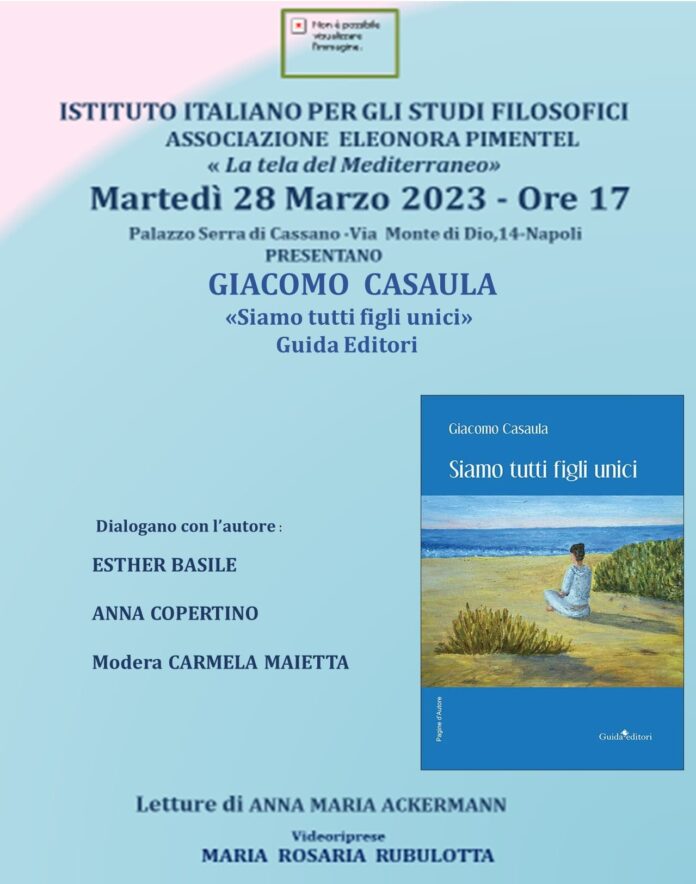 Martedì 28 marzo 2023, alle ore 17, presso Palazzo Serra di Cassano, in via Monte di Dio 14, a Napoli, Istituto Italiano per gli studi Filosofici, Associazione Eleonora Pimentel Fonseca “La tela del Mediterraneo”, presentano il libro “Siamo tutti figli unici”, di Giacomo Casaula.