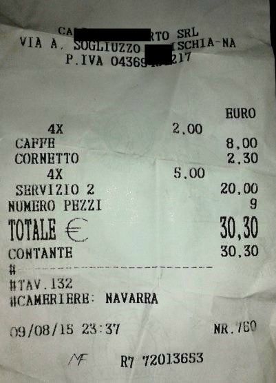 Se Ischia non rientra nella Top 10 delle mete più gettonate di questo Ferragosto 2015 il motivo è ben spiegato dallo scontrino condiviso su Facebook dalla giornalista Raffaella Iuliano, un conto di ben 30 euro per quattro caffè e un cornetto.