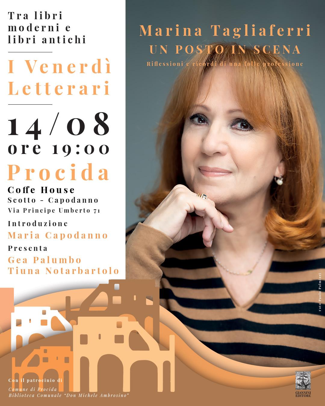 Procida. Un’isola che legge e abbraccia la cultura, Procida questa estate sta regalando intense emozioni. Un appuntamento da non perdere è quello previsto per mercoledì 14 agosto alle ore 19 al Coffe House con l’attrice e scrittrice Marina Tagliaferri, artista di punta della longeva e celebre soap opera “Un posto al sole”. La nota attrice italiana presenterà il suo ultimo libro “Un posto in scena” pubblicato dalla storica casa editrice napoletana Giannini Editore. Introduce la presentazione Maria Capodanno e dialogheranno con l’autrice Gea Palumbo e Tiuna Notarbartolo.