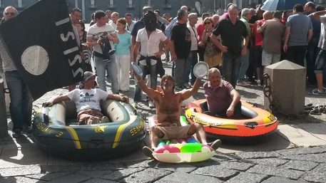 Protesta in Campania. Una provocatoria protesta quella davanti la prefettura di Napoli: un gruppo di operai del Consorzio Unico di Bacino, che si occupa del settore rifiuti, ha protestato con gommoni da spiaggia, un cappuccio nero in testa e una bandiera nera con la scritta “Isiss” (“Io sono italiano senza stipendio”).