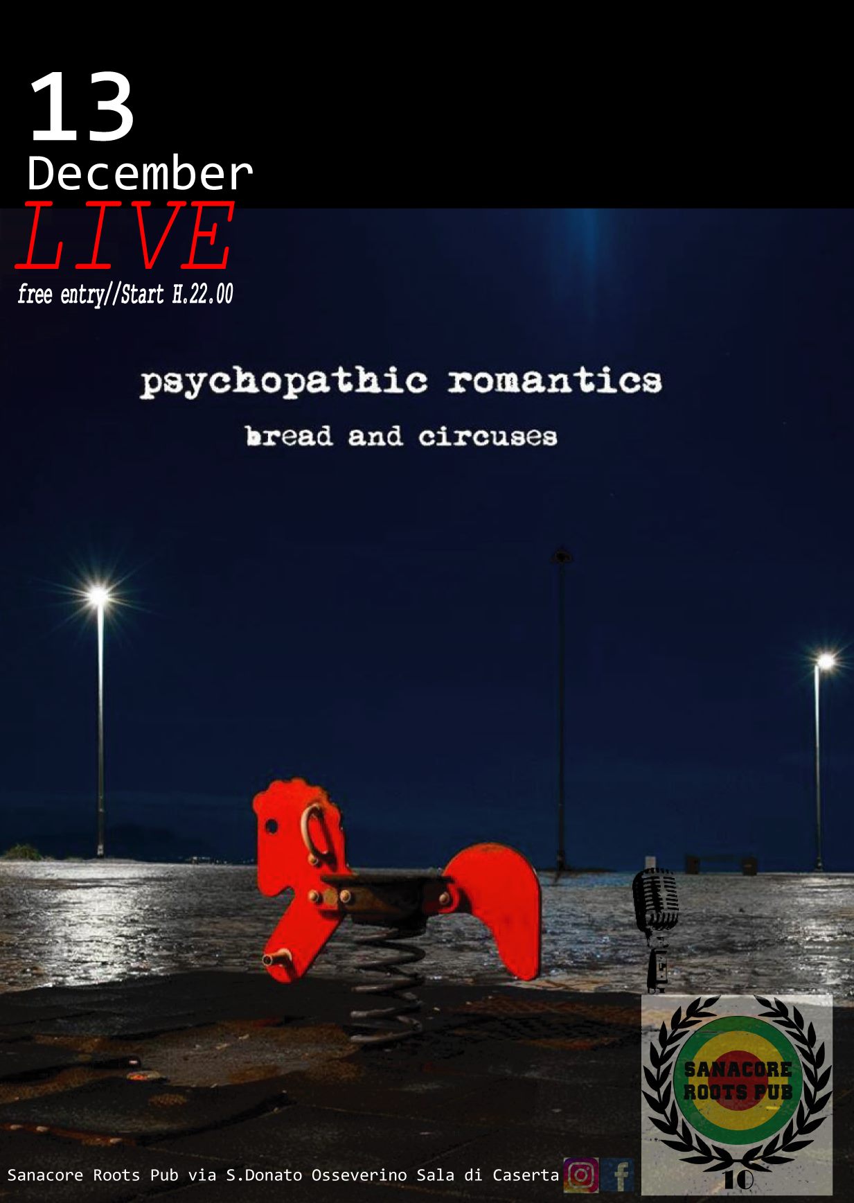 Venerdì 13 dicembre alle ore 22 sul palchetto del Sanacore a Caserta in via San Donato Osservino 12 a Sala di Caserta si esibiranno gli “Psychopathic Romantics” band italo-americana che da anni esprime solo musica di qualità al servizio di sperimentazioni ed evoluzioni sonore.
