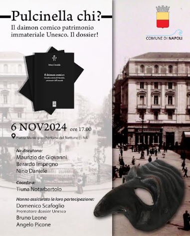Appuntamento imperdibile, oggi, mercoledì 6 novembre alle ore 17 in piazza Municipio a Napoli alla Fontana di Nettuno, in prossimità della scultura di Gaetano Pesce “Tu si ‘na cosa grande” verrà presentato il dossier per rendere Pulcinella patrimonio dell’Unesco. Ne discutono Maurizio de Giovanni, Berardo Impegno e Nino Daniele che proprio di recente ha pubblicato con la Giannini Editore il suo ultimo libro”Il daimon comico”, che affronta appunto tutti i significati filosofici, storici, antropologici della maschera di Pulcinella.