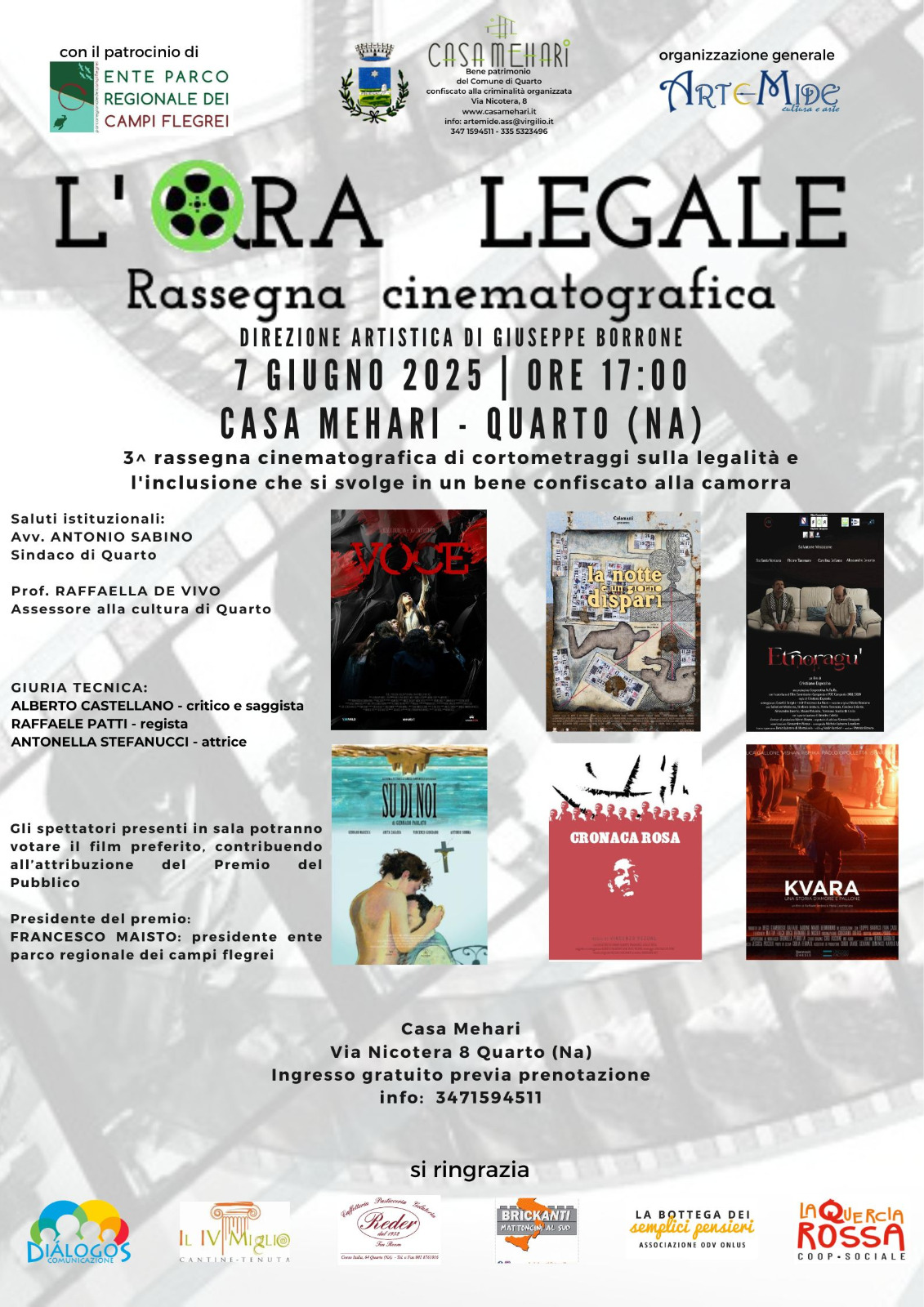 Patrocinata dall’amministrazione comunale di Quarto e dall’Ente Parco Regionale dei Campi Flegrei, la rassegna si svolgerà sabato 7 giugno 2025. A partire dalle ore 17.00 saranno presentate le opere finaliste, selezionate dallo storico del cinema Giuseppe Borrone. Seguirà, al termine delle proiezioni e di un Q&A con i registi dei film, la cerimonia di premiazione.