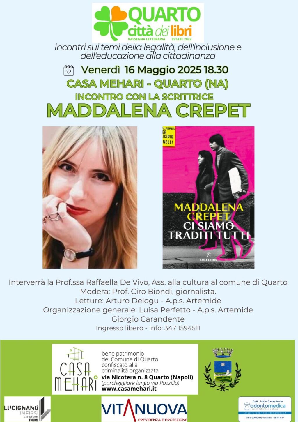 Un evento speciale per Quarto. Maddalena Crepet presenta il suo libro “Ci siamo traditi tutti”. L’appuntamento è per venerdì 16 maggio (alle ore 18,30) nel bene confiscato Casa Mehari, in via Nicotera n. 8. Ingresso libero.