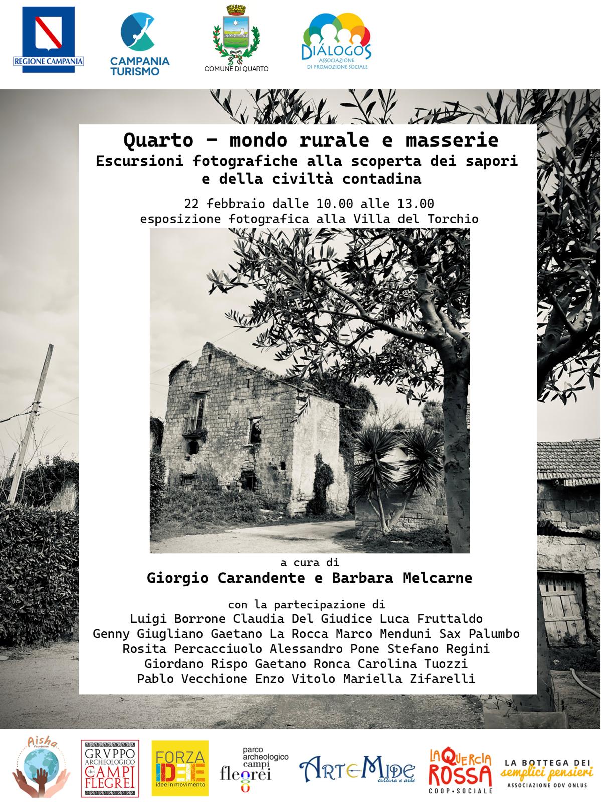 Si conclude la manifestazione “Quarto – Mondo rurale e masserie. Escursioni fotografiche alla scoperta dei sapori e della civiltà contadina”, l’evento culturale che ha coinvolto la città di Quarto, Napoli, durante le ultime settimane. Sabato 22 febbraio – dalle ore 10 alle 13 – nell’area archeologica della Villa del Torchio (nei pressi del Centro Commerciale Quarto Nuovo), si terrà la mostra fotografica tra i resti di una residenza agricola Romana. Si tratta di trentadue scatti, una selezione del lavoro effettuata da sedici fotografi che hanno visitato i luoghi più suggestivi che rappresentano la civiltà contadina quartese. Al vernissage, insieme ai fotografi e agli organizzatori, parteciperà Antonio Sabino, sindaco di Quarto. L’evento è aperto al pubblico.