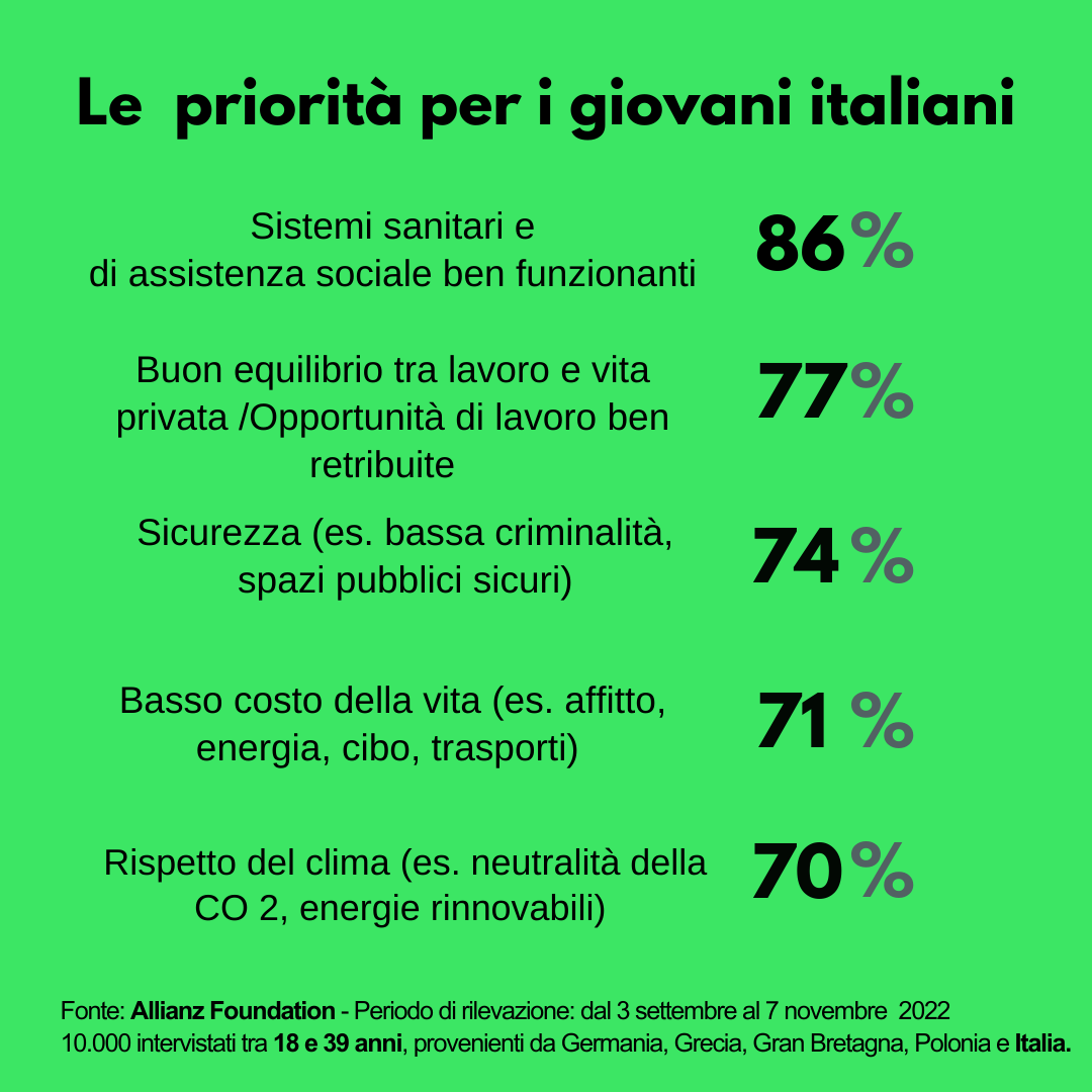 Il rapporto realizzato dalla Fondazione Allianz: un sondaggio su 10.000 mila giovani tra i 18 e i 39 anni di 5 Paesi, tra cui l’Italia. La ricerca offre uno spaccato inedito di come i giovani europei guardano e pensano al futuro e in particolare ai grandi temi di attualità: cambiamento climatico, crescita economica, diritti delle minoranze, militarizzazione.
