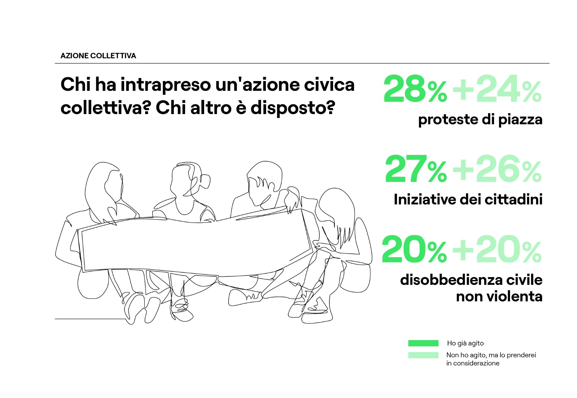 In confronto, i giovani italiani sono i più proattivi nel rispondere al cambiamento climatico e alle sue conseguenze ambientali e sociali – finora, soprattutto attraverso azioni individuali, come discutere il problema con la famiglia e gli amici e regolare il proprio consumo energetico. Tuttavia, le abitudini di acquisto cambiano più lentamente: ad oggi, in Italia, il 39% dei giovani ha già boicottato prodotti con un cattivo impatto ambientale, rispetto al 45% degli altri quattro Paesi. Oltre al cambiamento climatico, i temi che spingono i giovani italiani a impegnarsi includono il contrasto alle discriminazioni. Le iniziative dei cittadini hanno un fascino particolare in Italia, con il 35% che ha già partecipato (rispetto al 27% in altri Paesi) e un ulteriore +30% disposto a farlo in futuro (rispetto al +26%).