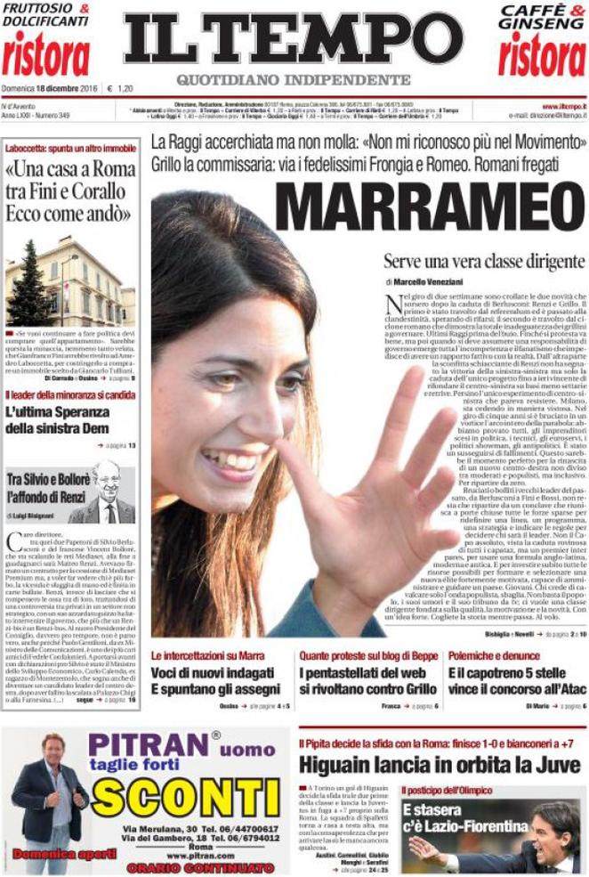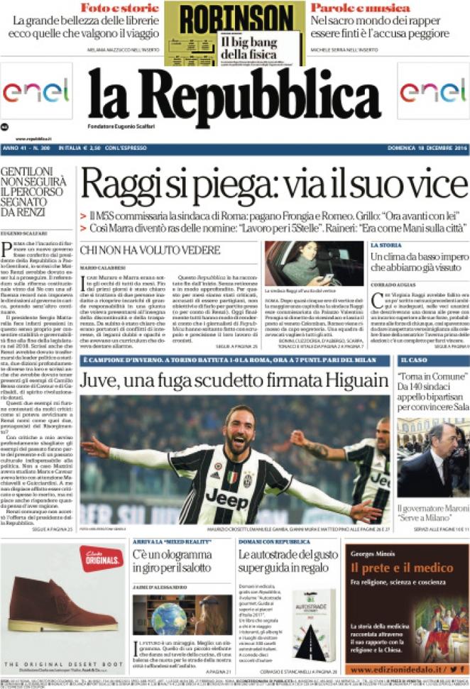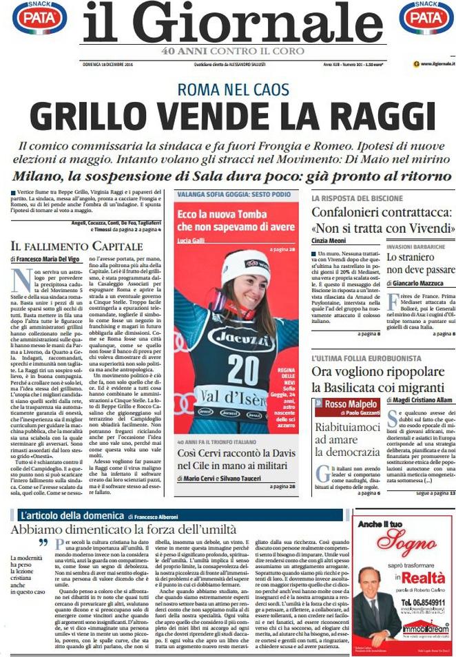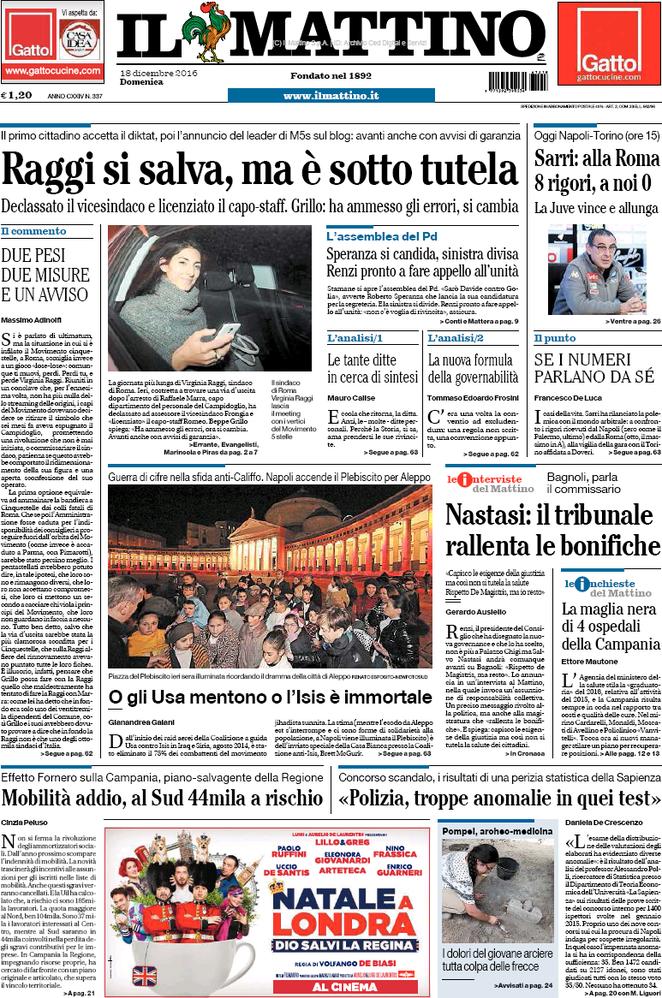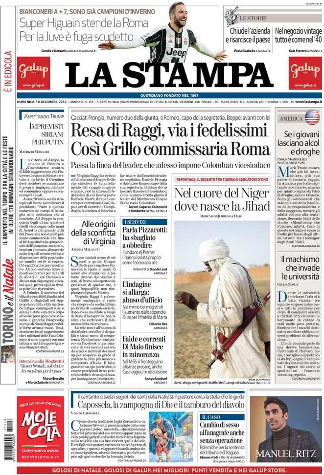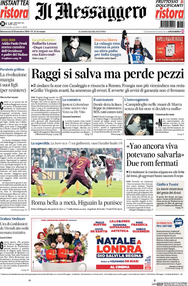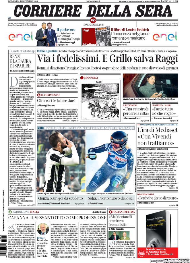 Ecco la rassegna stampa di tutte le prime pagine dei giornali di oggi, domenica 18 dicembre 2016. Al centro dell’attenzione il caso Raggi e il calcio, con la vittoria della Juve sulla Roma e il Napoli che mette nel mirino il Milan (pari ieri in casa con l’Atalanta) per il sorpasso.