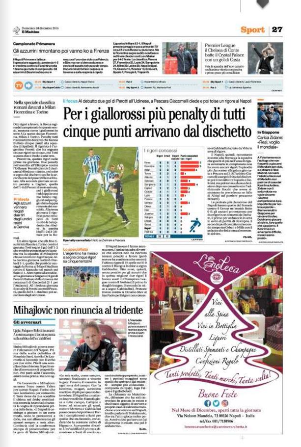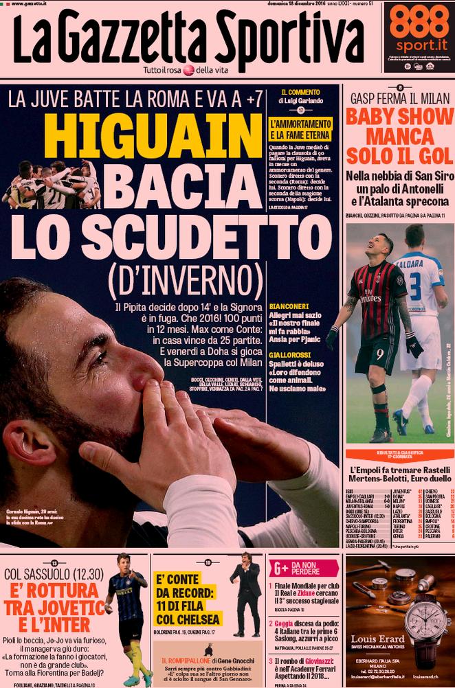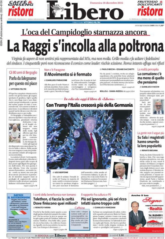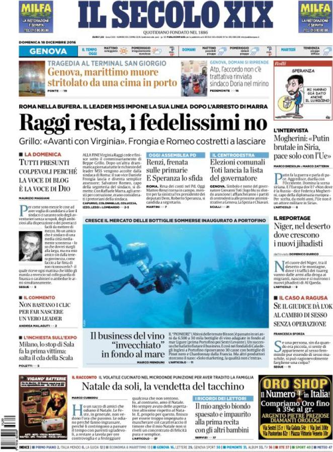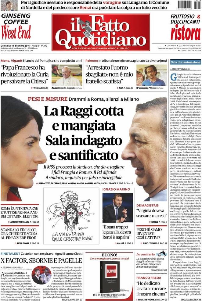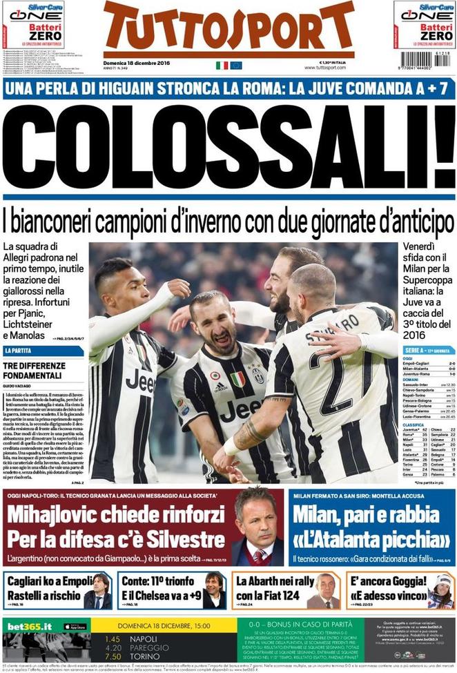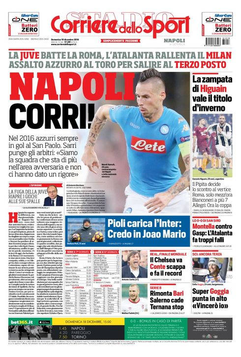 Ecco la rassegna stampa di tutte le prime pagine dei giornali di oggi, domenica 18 dicembre 2016. Al centro dell’attenzione il caso Raggi e il calcio, con la vittoria della Juve sulla Roma e il Napoli che mette nel mirino il Milan (pari ieri in casa con l’Atalanta) per il sorpasso.