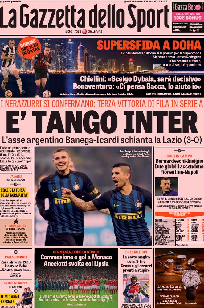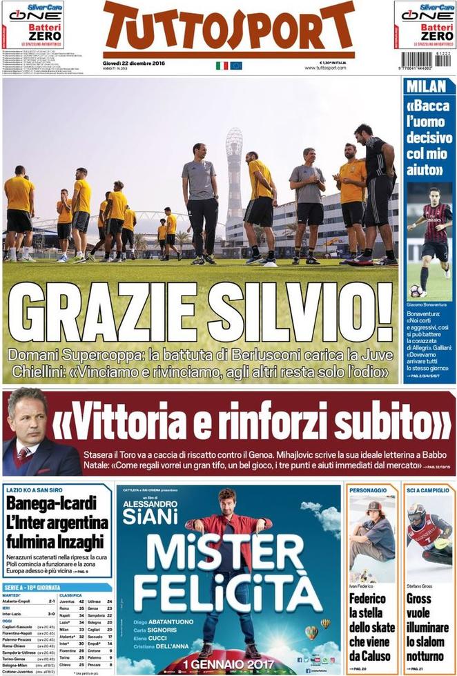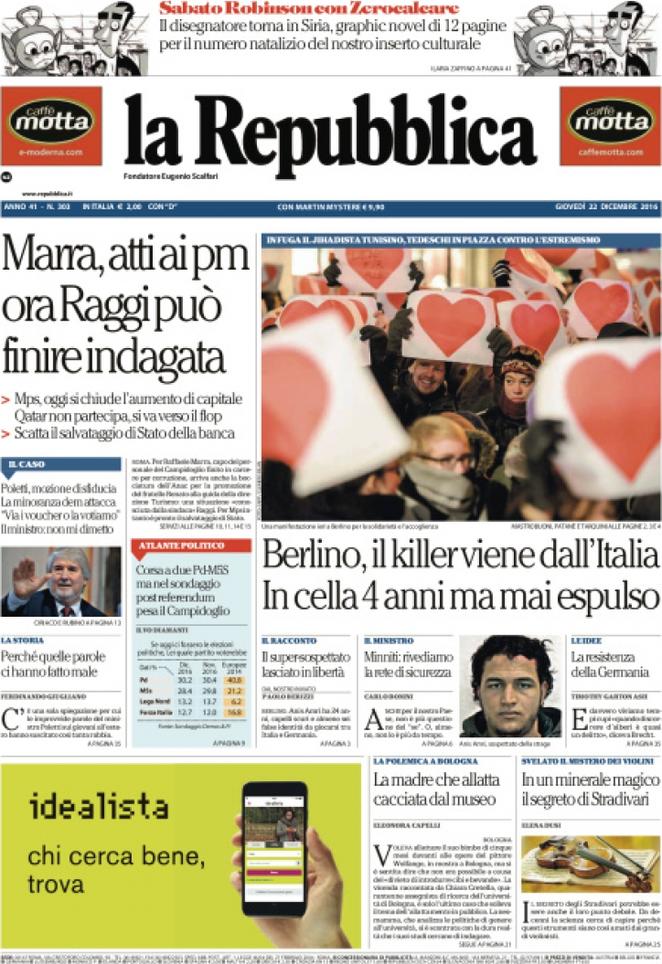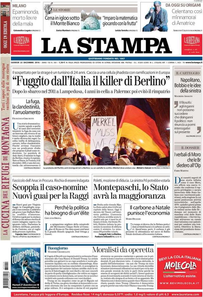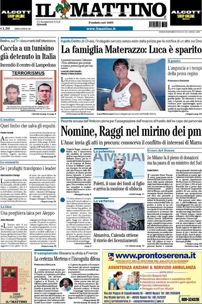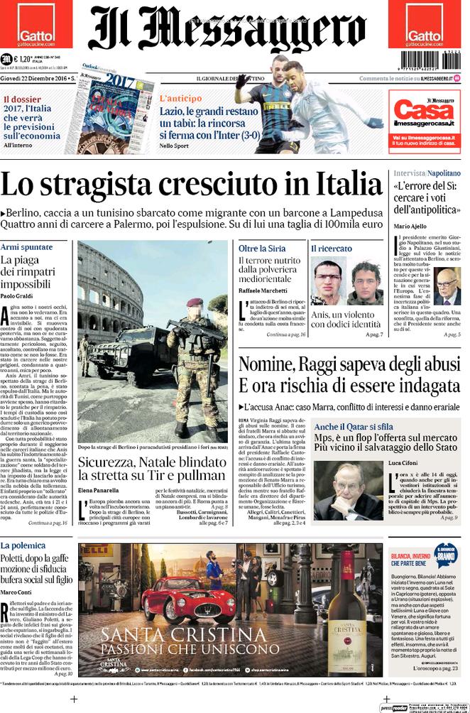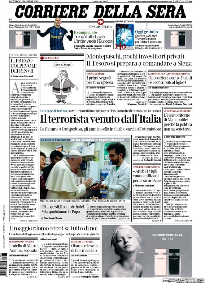 Ecco la rassegna stampa di tutte le prime pagine dei giornali di oggi, giovedì 22 dicembre 2016. Al centro dell’attenzione la scena politica italiana e il campionato di calcio, con il Napoli che andrà a Firenze per chiudere nel modo migliore possibile il suo 2016.