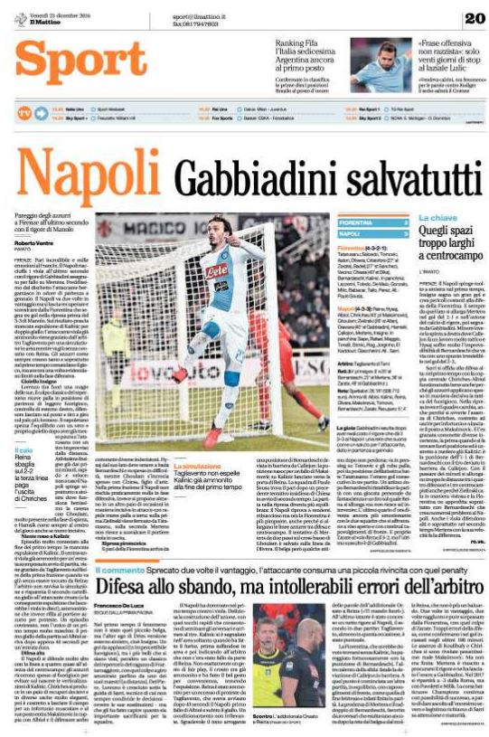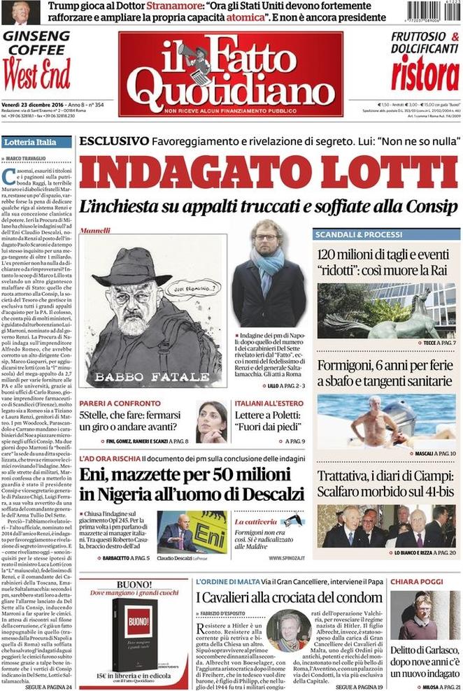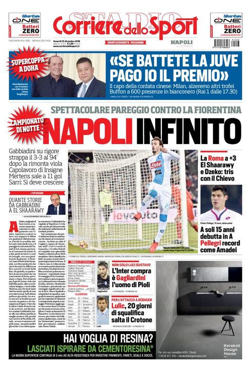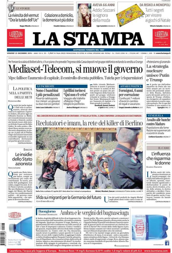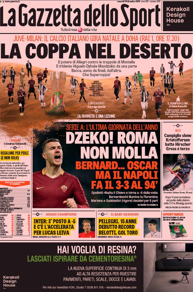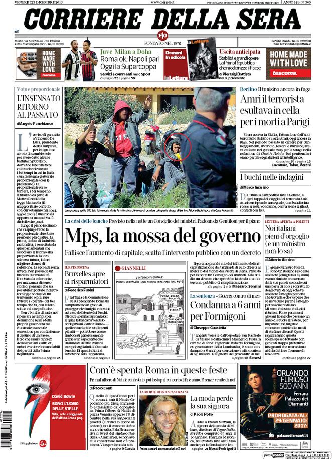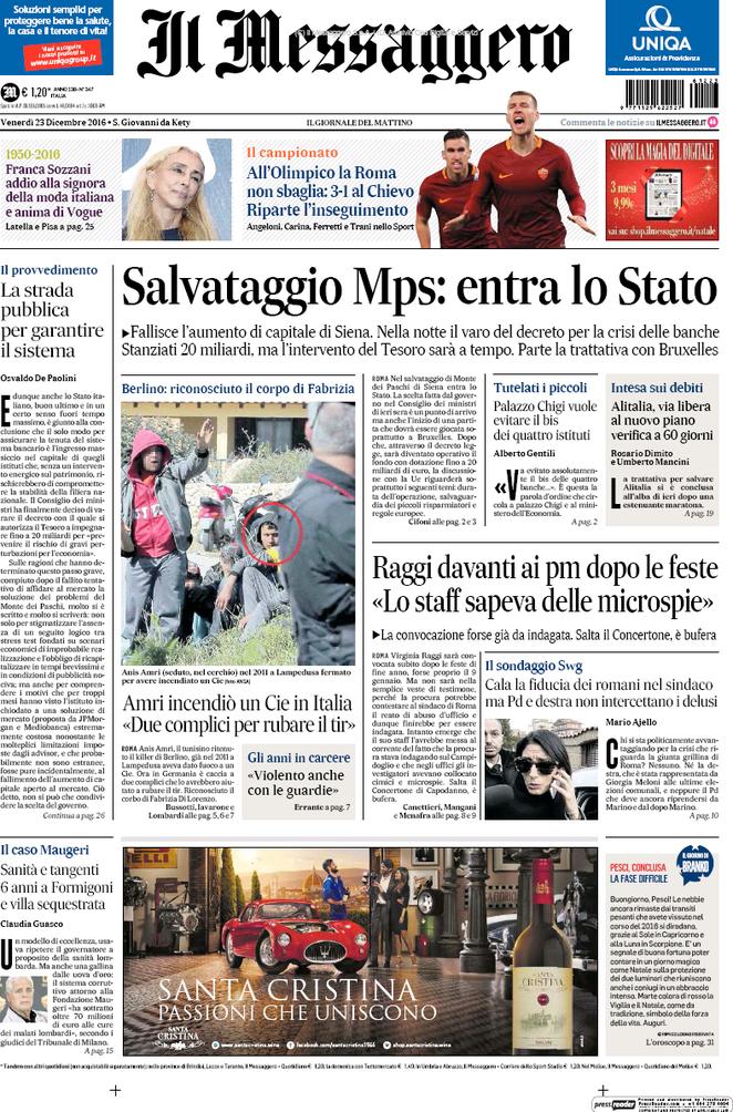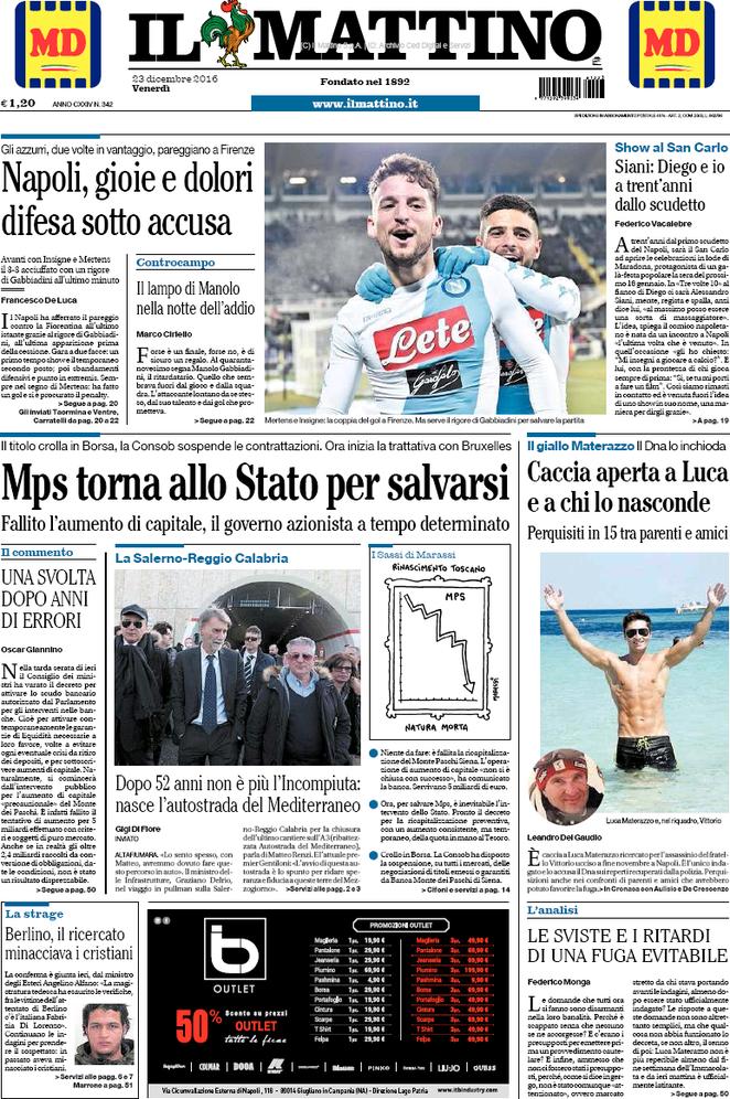 Ecco la rassegna stampa di tutte le prime pagine dei giornali di oggi, venerdì 23 dicembre 2016. Al centro dell’attenzione la vicenda del Monte dei Paschi di Siena e il campionato di calcio, con il Napoli che riacciuffa un pari prezioso a Firenze, grazie al rigore allo scadere trasformato da Gabbiadini.