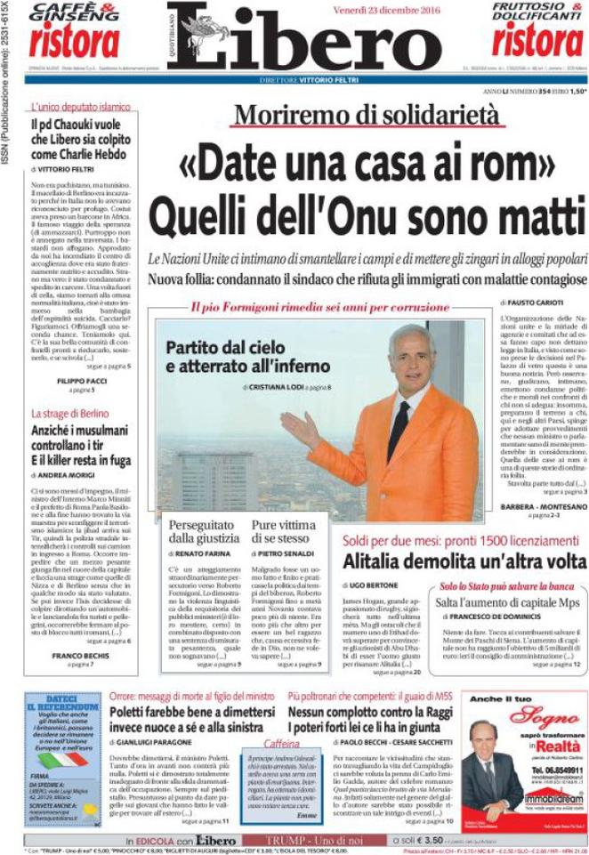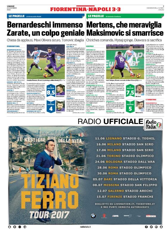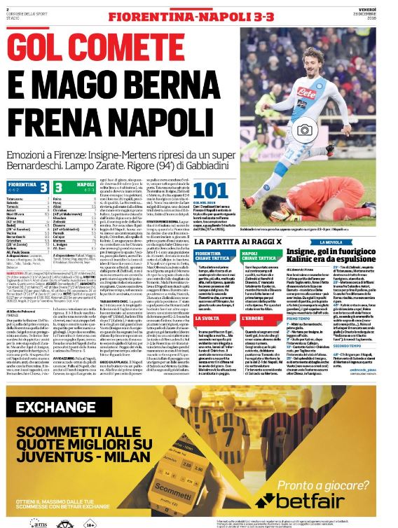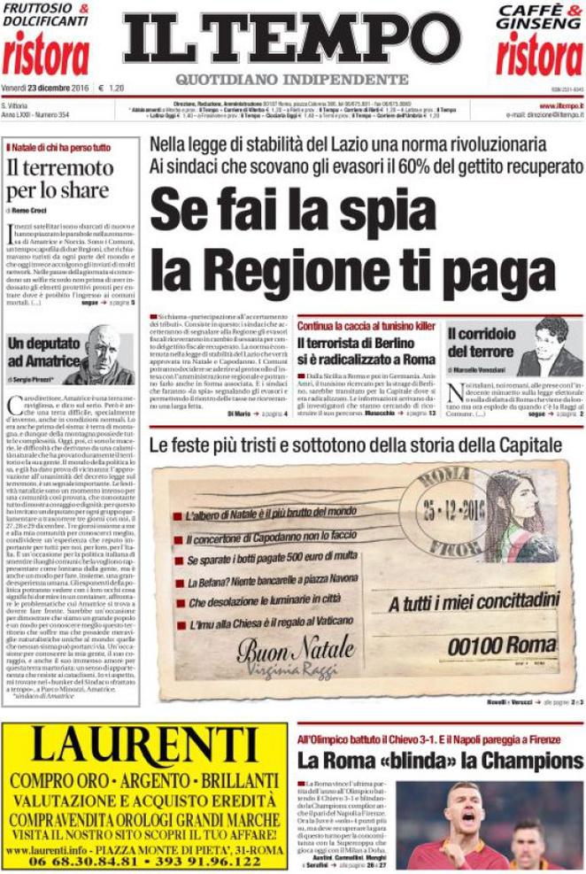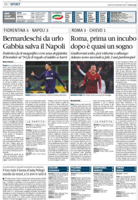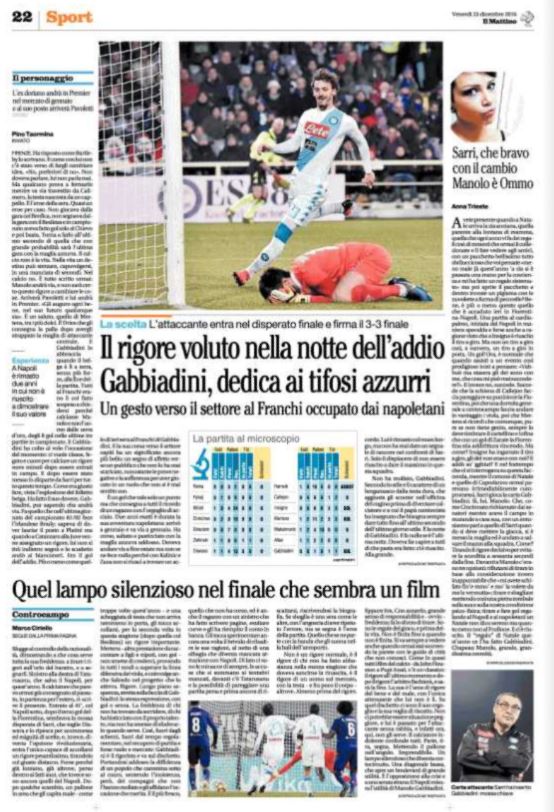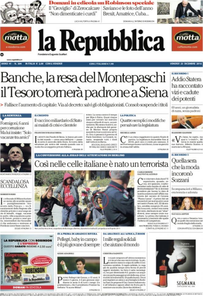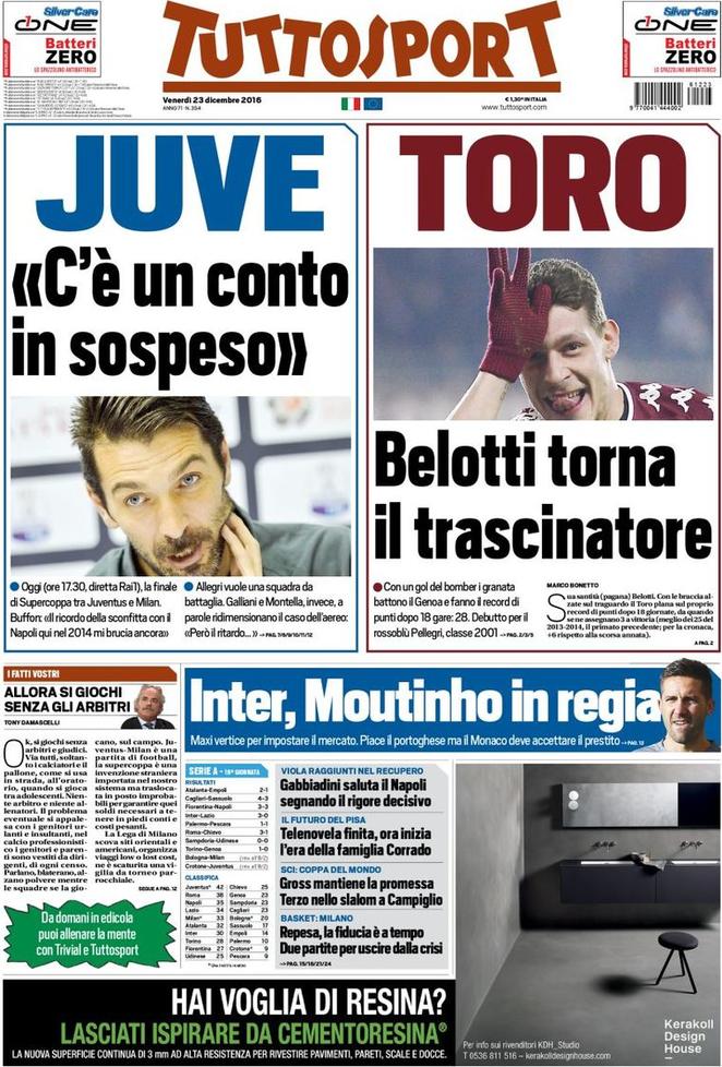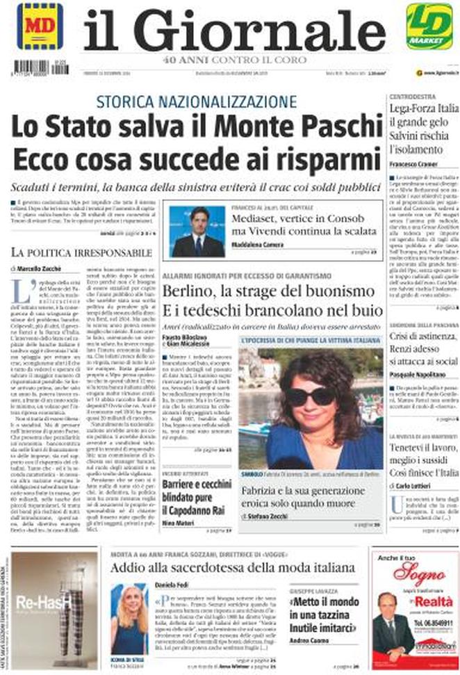 Ecco la rassegna stampa di tutte le prime pagine dei giornali di oggi, venerdì 23 dicembre 2016. Al centro dell’attenzione la vicenda del Monte dei Paschi di Siena e il campionato di calcio, con il Napoli che riacciuffa un pari prezioso a Firenze, grazie al rigore allo scadere trasformato da Gabbiadini.