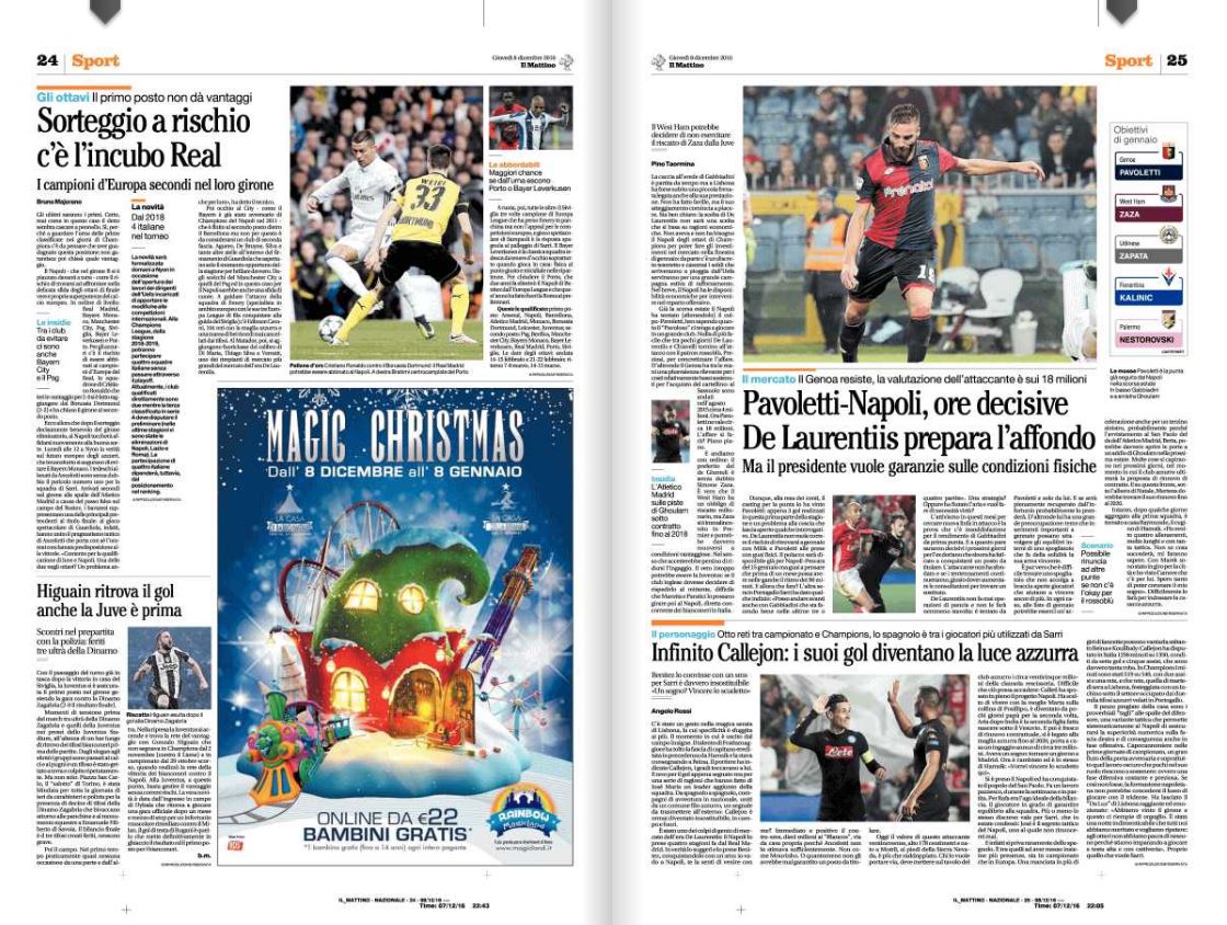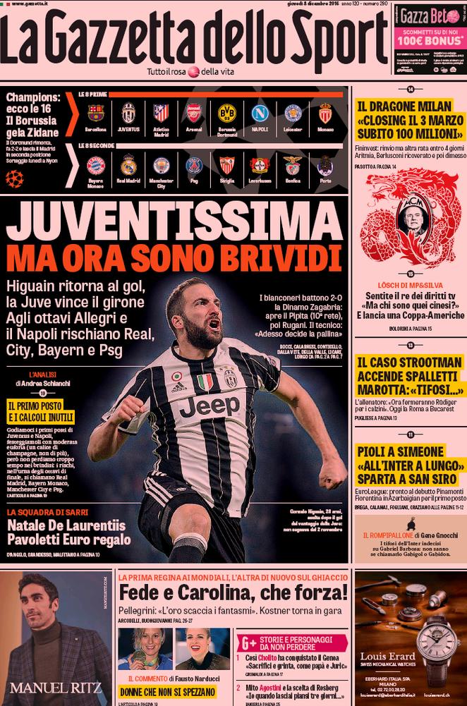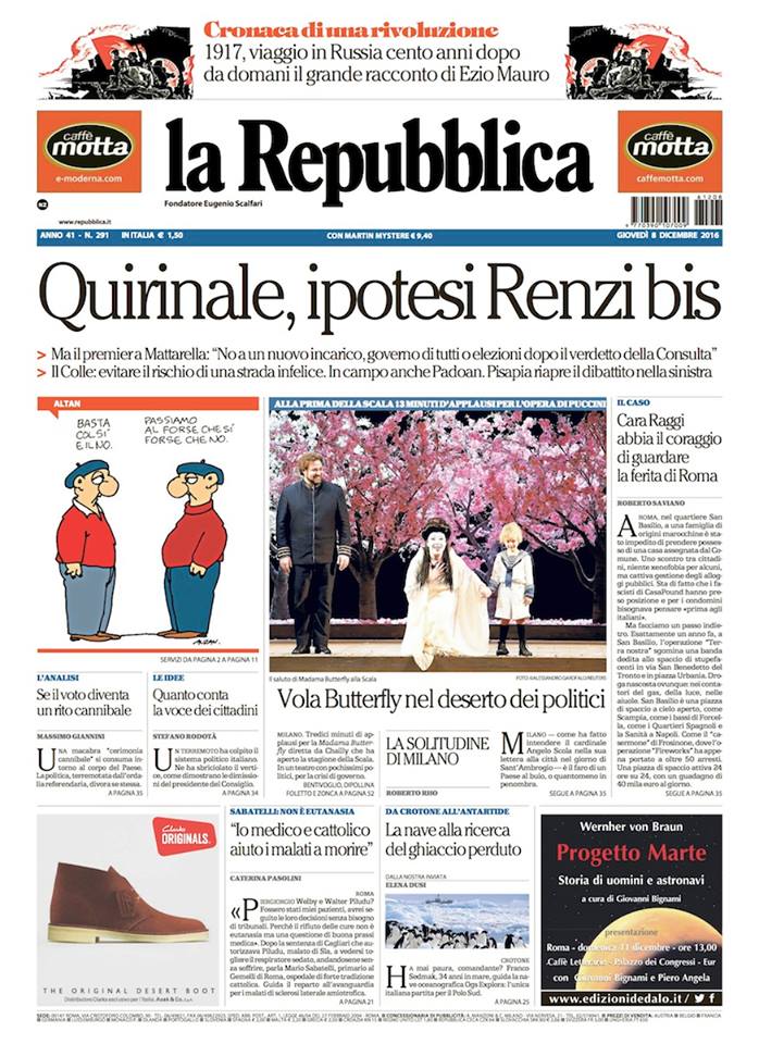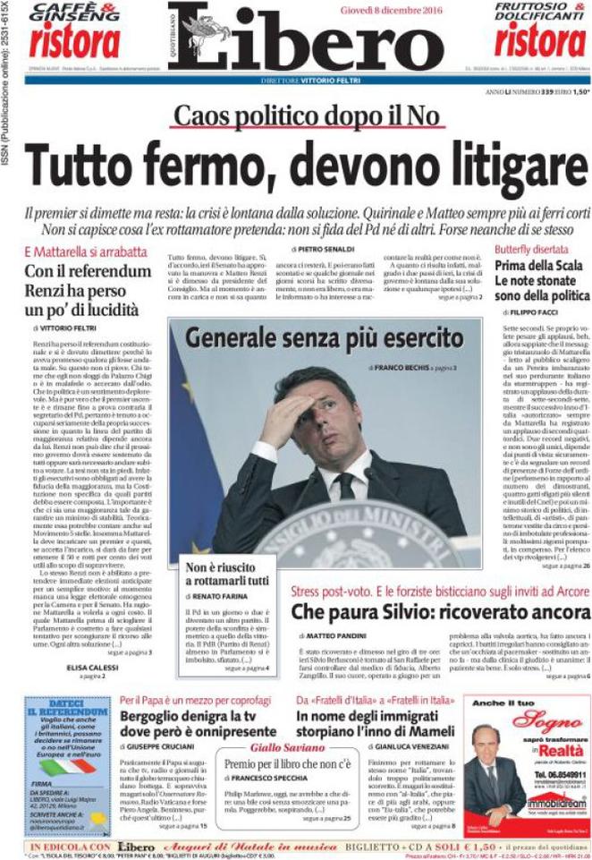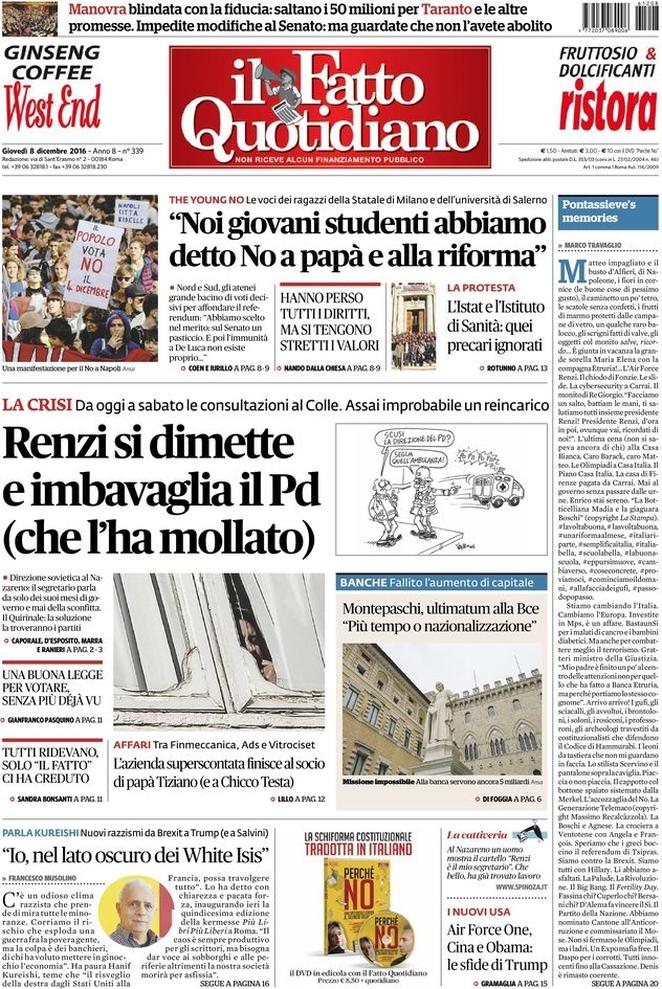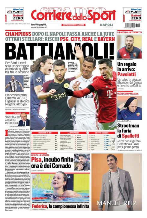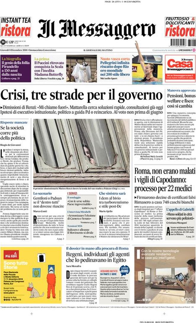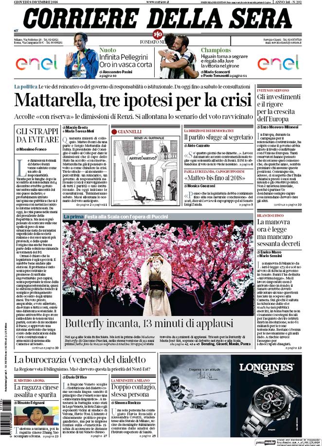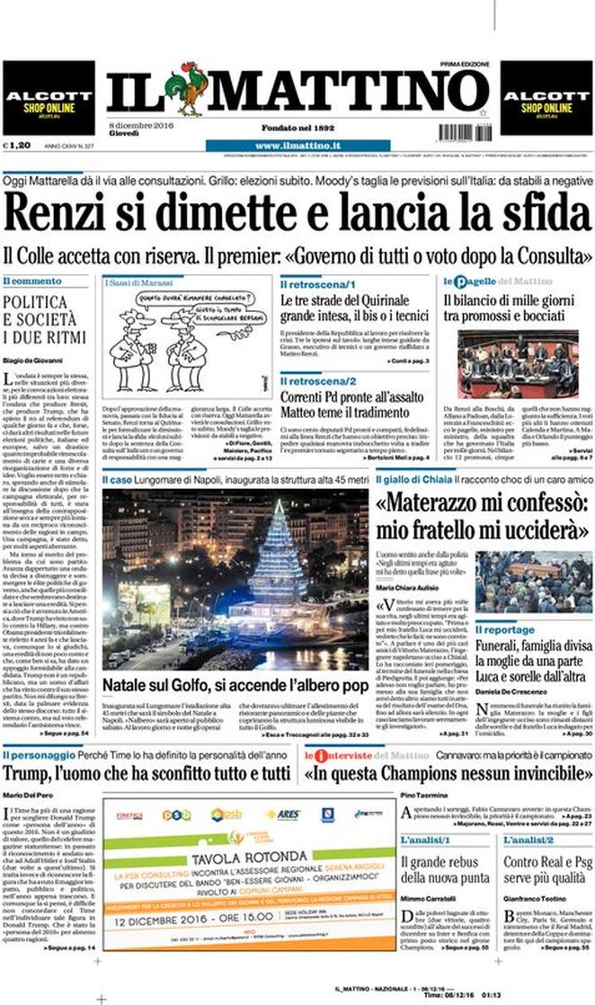 Ecco la rassegna stampa di tutte le prime pagine dei giornali di oggi, giovedì 8 dicembre 2016. Al centro dell’attenzione la situazione politica del post Referendum con la possibilità di un Renzi bis e le possibili avversarie del Napoli di Maurizio Sarri agli Ottavi di Finale di Champions League.