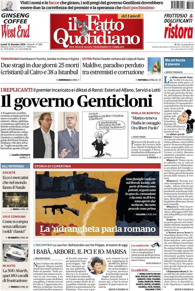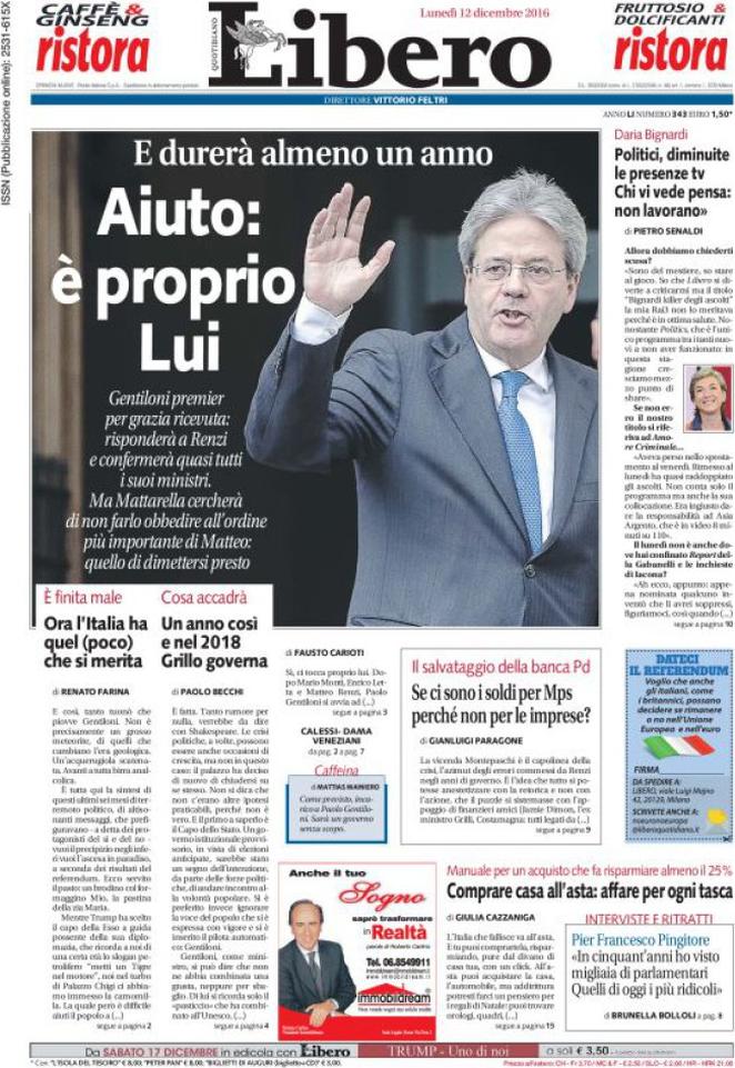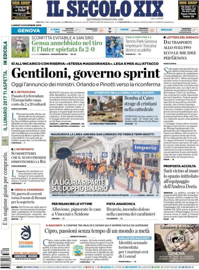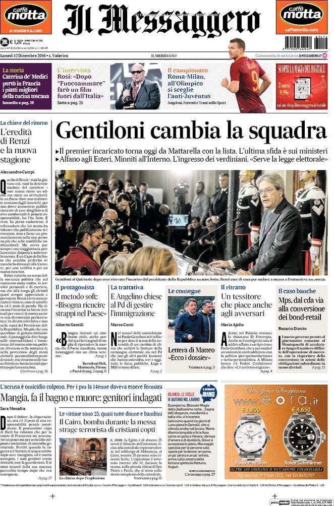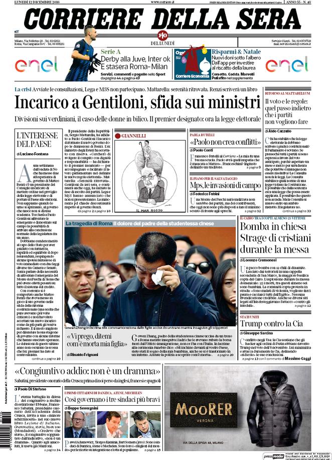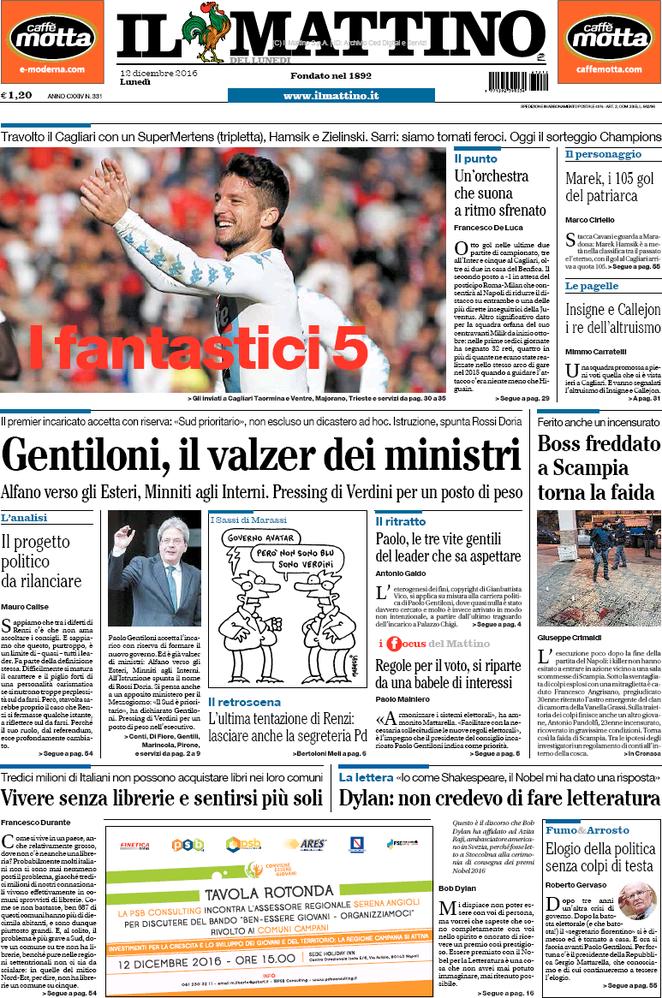 Ecco la rassegna stampa di tutte le prime pagine dei giornali di oggi, lunedì 12 dicembre 2016. Al centro dell’attenzione l’incarico di formare il Governo assegnato a Gentiloni e il Napoli che continua la sua rimonta in campionato, grazie alla cinquina al Cagliari.