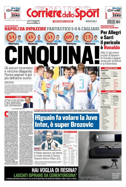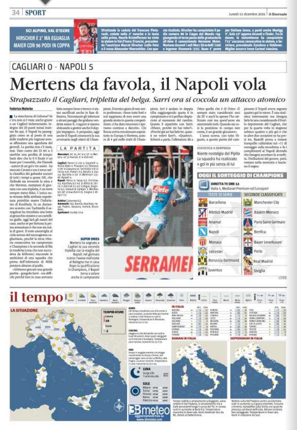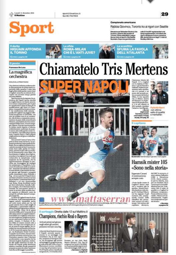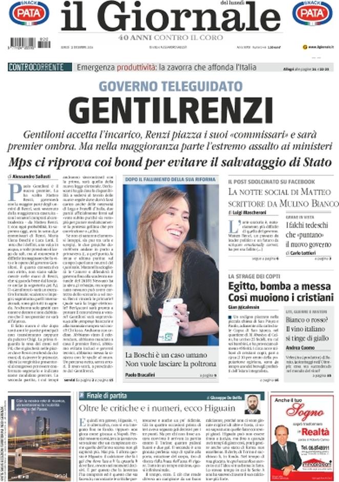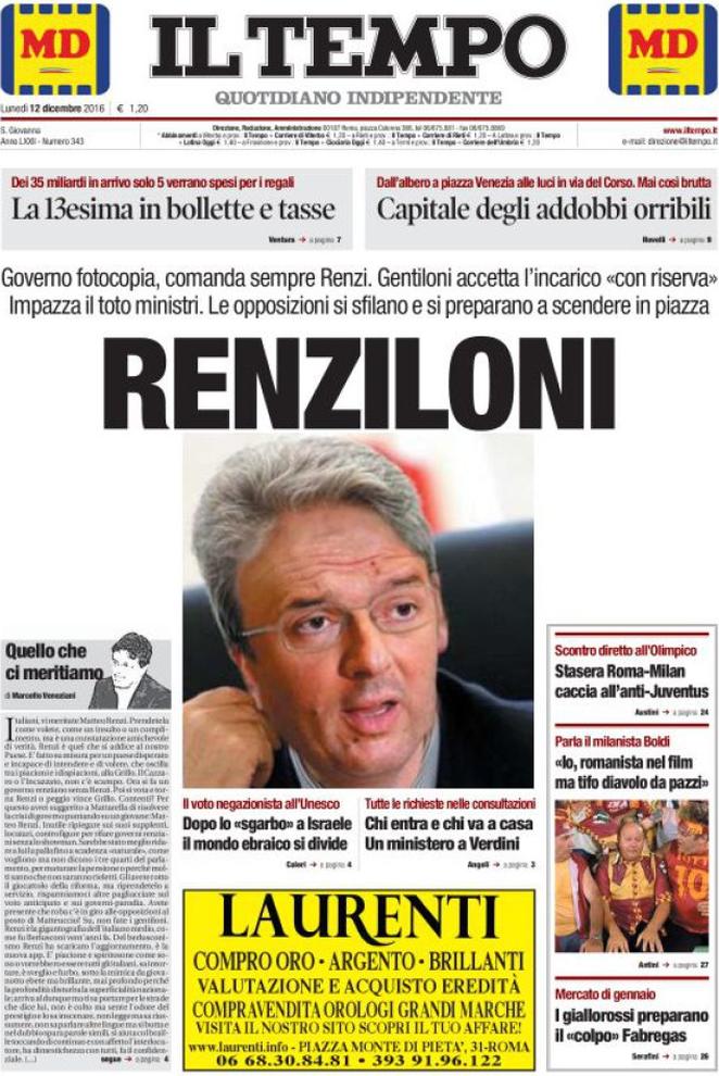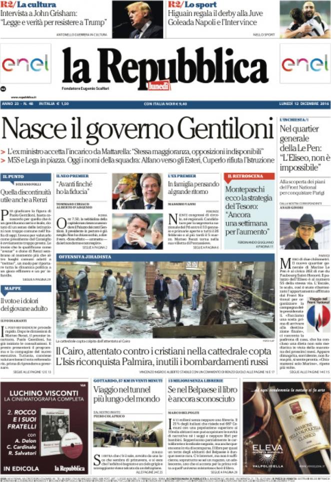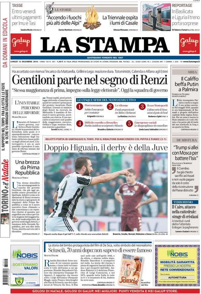 Ecco la rassegna stampa di tutte le prime pagine dei giornali di oggi, lunedì 12 dicembre 2016. Al centro dell’attenzione l’incarico di formare il Governo assegnato a Gentiloni e il Napoli che continua la sua rimonta in campionato, grazie alla cinquina al Cagliari.