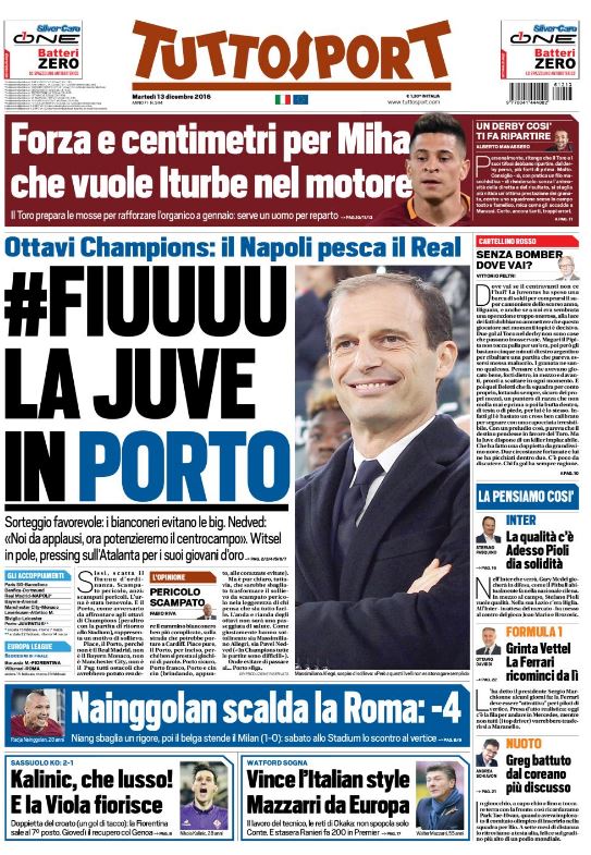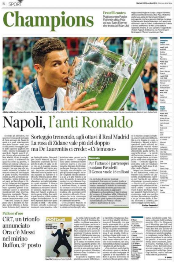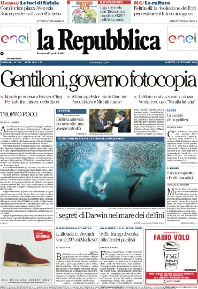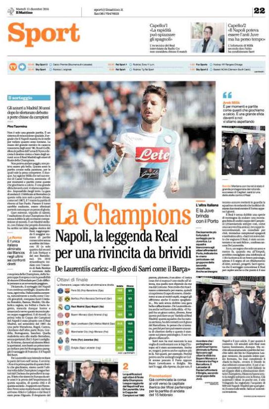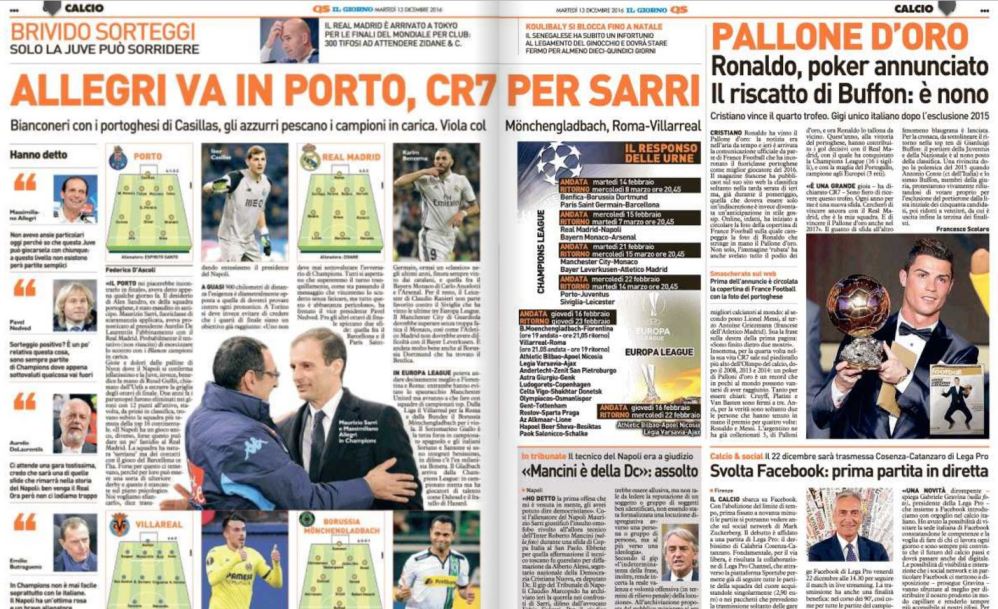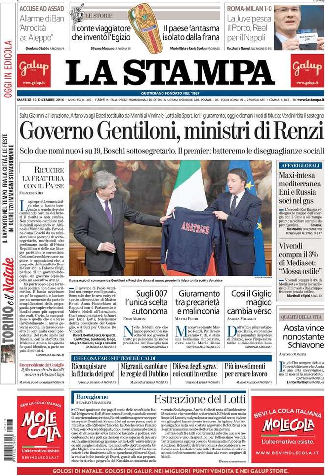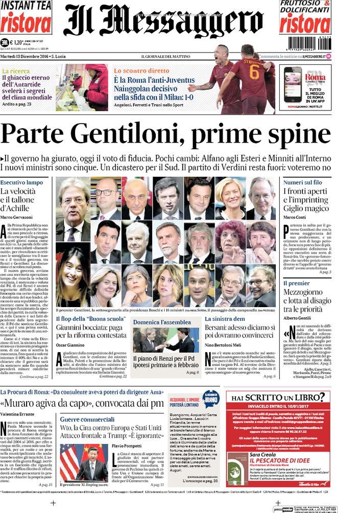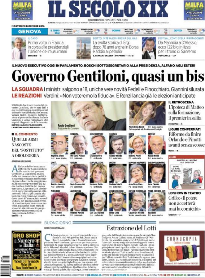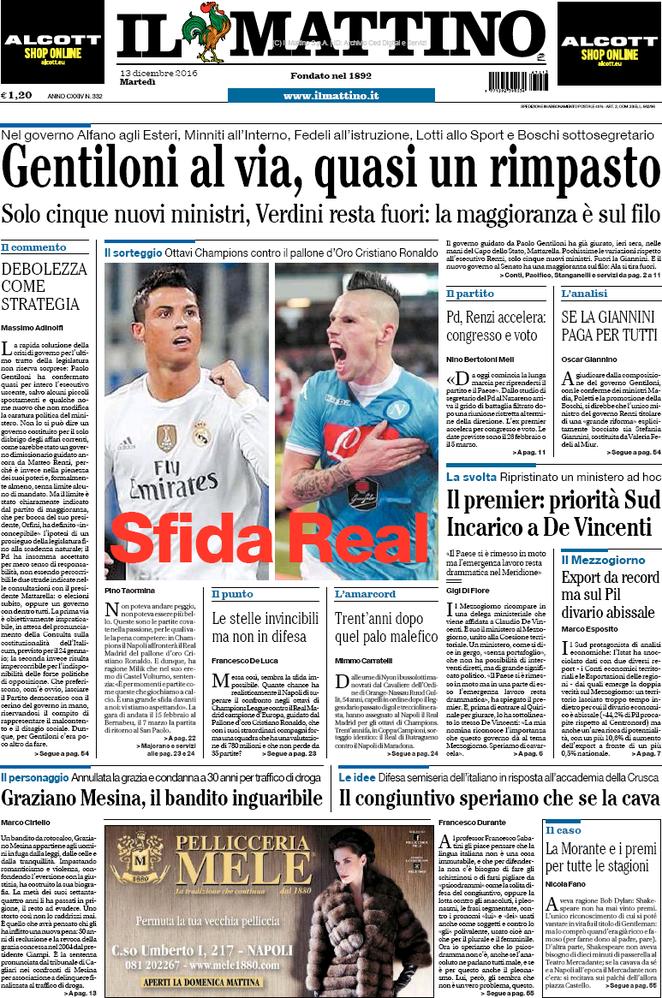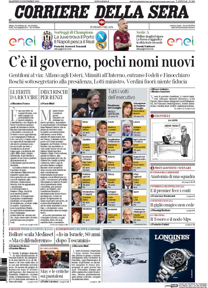 Ecco la rassegna stampa di tutte le prime pagine dei giornali di oggi, martedì 13 dicembre 2016. Al centro dell’attenzione il nuovo, ma non troppo, Governo Gentiloni e il sorteggio Champions che ha visto uscire dall’urna di Nyon Napoli-Real Madrid e Juventus-Porto.