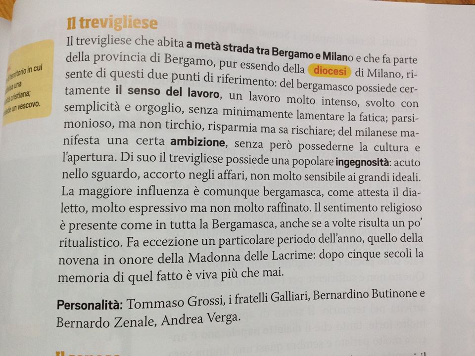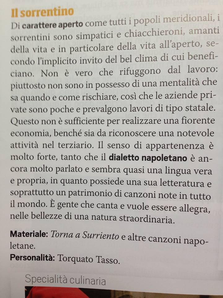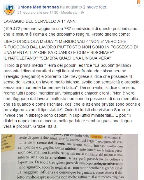 Ecco lo sfogo degli amministratori della pagina Facebook Unione Mediterranea che accompagna le foto scattate al libro incriminato: “Libro di scuola media: ‘I Meridionali? Non è vero che rifuggono dal lavoro, piuttosto non sono in possesso di una mentalità che sa quando e come rischiare. Il napoletano? Sembraquasi una lingua vera.’ Il libro di prima media “Terra dei popoli”, editrice “La Scuola” (Milano) racconta i diversi caratteri degli italiani confrontando chissà perché Treviglio (Bergamo) e Sorrento. Del trevigliese si dice che possiede “il senso del lavoro, un lavoro molto intenso, svolto con semplicità e orgoglio, senza minimamente lamentare la fatica”. Dei sorrentini si dice che sono, “come tutti i popoli meridionali”, “simpatici e chiacchieroni”. “Non è vero che rifuggono dal lavoro: piuttosto non sono in possesso di una mentalità che sa quando e come rischiare, così che le aziende private sono poche e prevalgono lavori di tipo statale”. Quindi i turisti che visitano Sorrento invece che in albergo sono ospitati in cupi uffici ministeriali… E poi: “Il dialetto napoletano è ancora molto parlato e sembra quasi una lingua vera e propria”. Grazie, Italia“.