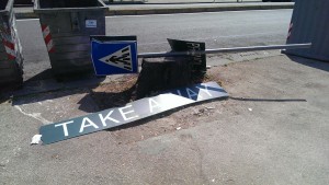 Napoli – Insolito lo spettacolo in cui ci si può imbattere durante una passeggiata di sabato mattina a Fuorigrotta, depositati accanto ai cassonetti dei rifiuti antistante il piazzale della Curva “A” dello stadio S. Paolo oggi è possibile trovare oltre ad un cartello stradale di attraversamento pedonale anche i grossi cartelli “Take Away” e “Prendi e vai” appartenenti al McDonald poco distante; che la nota catena di fast food amata più dai giovani che dai loro genitori stia lanciando un’ironica (ed involontaria) campagna che coinvolge sia il problema dello “junk food” che quello dei rifiuti?