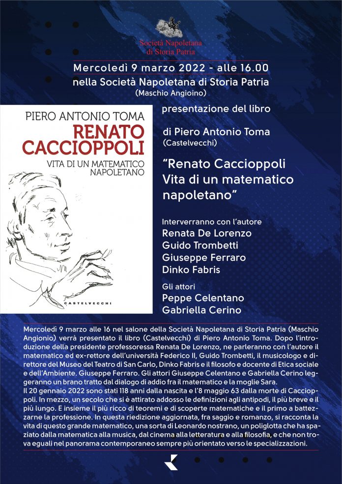 Mercoledì 9 marzo alle 16 nel salone della Società Napoletana di Storia Patria (Maschio Angioino), in Via Vittorio Emanuele III, 310, 80133 Napoli, verrà presentato il libro (Castelvecchi) di Piero Antonio Toma “Renato Caccioppoli. Vita di un matematico napoletano”.