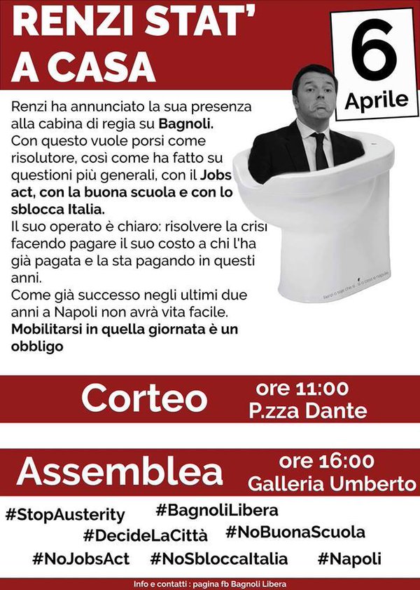 Domani, mercoledì 6 aprile a Napoli arriverà il presidente del consiglio Matteo Renzi per presenziare alla cabina di regia su Bagnoli che si riunirà in prefettura. Proprio per quel giorno, è stato lanciato, dall’associazione ‘Bagnoli libera’, un corteo “Renzi stat’ a casa”, con concentramento da Piazza Dante.