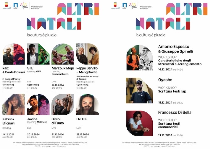 “Il programma di ‘RI/NATI’ – dichiara Ferdinando Tozzi, delegato del Sindaco per l’industria musicale e l’audiovisivo – non solo abbraccia lo spirito del progetto Napoli Città della Musica, ma soprattutto dimostra che, come recita il claim di ‘Altri Natali’, la cultura è plurale. Il linguaggio universale per eccellenza, la musica, riesce a far convivere, in una sintesi che unisce, questa pluralità, favorendo la reciproca conoscenza e le pratiche di integrazione sociale. Il tutto in un luogo simbolo della città: piazza Mercato, nella quale la Chiesa di Santa Croce e Purgatorio al Mercato, chiusa per molto tempo e riaperta quest’anno, si candida, grazie a una ricca programmazione di mostre ed eventi, a volano di sviluppo culturale di tutta la piazza”.