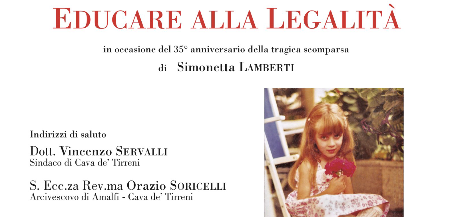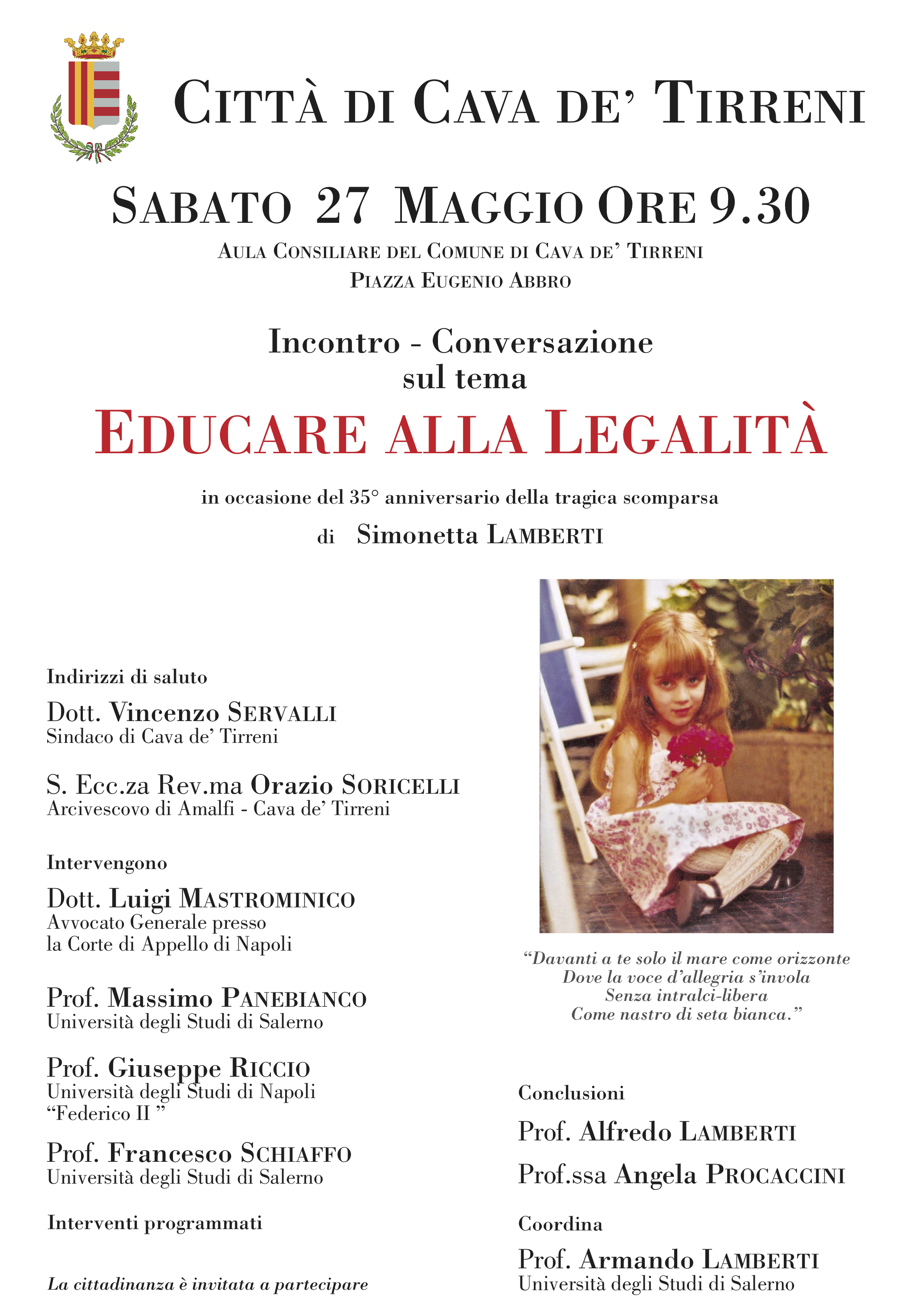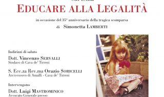 Sabato 27 maggio, ore 9.30, presso l’Aula Consiliare del Comune di Cava de’ Tirrein, in piazza Eugenio Abbro, incontro-conversazione sul tema Educare alla legalità, in occasione del 35esimo anniversario della tragica scomparsa di Simonetta Lamberti.