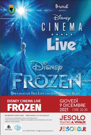 A seguire il 9 dicembre debutta “Frozen”, regia e coreografia di Alessio Guerra per la Dreaming Academy. Nella stessa giornata ci sarà sul palco del teatro un workshop del Disney Cinema Live“Frozen” con la possibilità a tutti di entrare nel magico mondo del Regno di Arendelle. Insieme al cast si lavorerà su alcuni pezzi, staging e coreografie, vivendo la magia del castello e le canzoni che tutti noi conosciamo. Verranno selezionate per lo spettacolo quattro piccole performer che interpreteranno Anna ed Elsa, da bambine e successivamente da adolescenti.