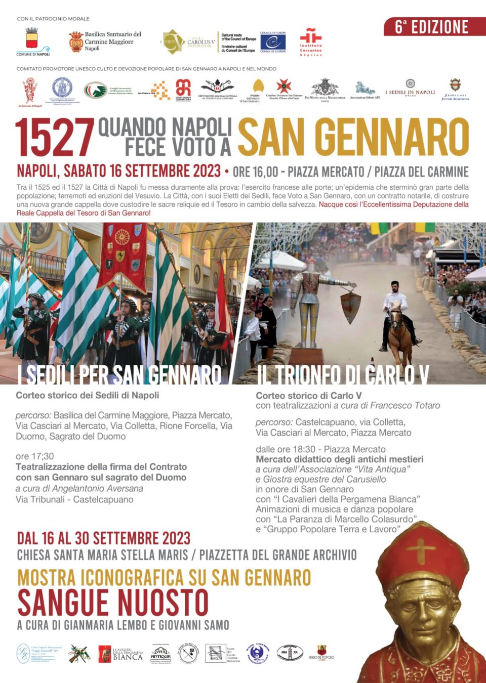 Sotto l’egida del “Comitato promotore UNESCO per la candidatura del culto e devozione popolare di San Gennaro a Napoli e nel Mondo” nato nel 2020 per iniziativa dell’Arcidiocesi di Napoli, del LUPT dell’Università Federico II, dell’ICOMOS, della Deputazione della Cappella del Tesoro di San Gennaro, del Comitato Diocesano San Gennaro, del Museo Diocesano, della Fondazione Fare Chiesa e Città, nonché da Sebeto APS, Fondazione Ferrante Sanseverino e Associazione I Sedili di Napoli ONLUS, ritorna per la sua sesta Edizione, l’evento: “1527 Quando Napoli fece Voto a San Gennaro”, con il patrocinio morale dal Comune di Napoli e dell’Istituto Cervantes in Napoli che per questa edizione 2023, si arricchisce oltre che dell’ormai tradizionale grande corteo storico degli Eletti dei Sedili anche di uno spettacolare certame cavalleresco. “La Giostra del carusiello” che era una gara molto in voga soprattutto in epoca spagnola e chi si teneva in onore del Santo Patrono.