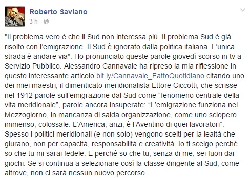Ospite, giovedì scorso, della trasmissione televisiva Servizio Pubblico, andata in onda sull’emittente La7, lo scrittore e giornalista napoletano, Roberto Saviano, toccato l’argomento meridione ha detto: “Il problema vero è che il Sud non interessa più. Il problema Sud è già risolto con l’emigrazione. Il Sud è ignorato dalla politica italiana. L’unica strada è andare via“. Da questo suo intervento, ripreso oggi dallo stesso Roberto Saviano sulla sua personale pagina Facebook, che l’autore di Gomorra è voluto ritornare sull’argomento, segnalando ai suoi contatti un interessante articolo scritto da Alessandro Cannavale, a il Fatto Quotidiano.
