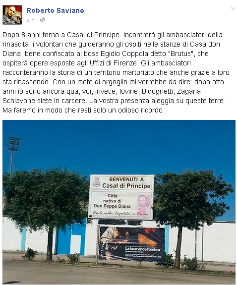 Questo il post lasciato da Roberto Saviano sulla sua pagina Facebook ufficiale in merito al ritorno a Casal di Principe.