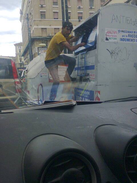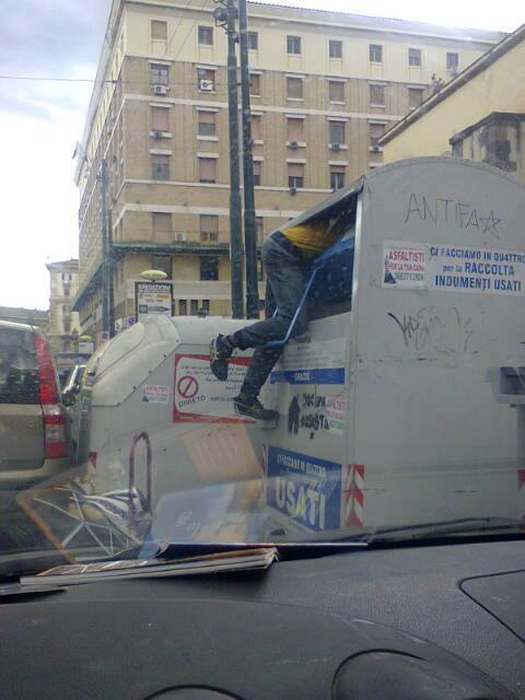 Quante volte scartando i nostri abiti usati ci siamo chiesti chi li avrebbe indossati dopo di noi? Ora abbiamo la risposta: i ladri di vestiti. Sono immagini shock quelle raccolte questa mattina in via Medina a Napoli, a pochi passi da piazza Municipio. Nelle foto si vede chiaramente un ragazzo di etnia rom introdursi, con movenze da vero contorsionista, all’interno di uno dei 400 contenitori disseminati in città dall’Asìa per la raccolta degli abiti usati, che andrebbero consegnati alle associazioni che assistono i bisognosi.
