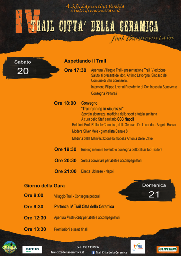 In occasione del 4° TRAIL CITTA’ DELLA CERAMICA “sui sentieri del Parco Regionale del Matese” di San Lorenzello (BN) il 20 ottobre 2018 alle ore 18:00 in Piazza Filippo Lavorgna nella tensostruttura del Villaggio Trail si terrà il seminario organizzato dallo staff medico SSC Napoli intitolato “Trail running in sicurezza, medicina dello sport e tutela sanitaria. Preparazione atletica e alimentazione”.