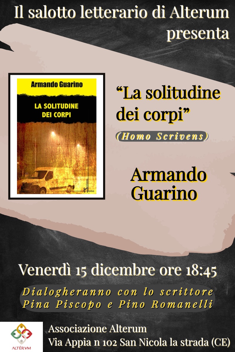 Il 15 dicembre alle ore 18:45 il Salotto Letterario dell’associazione Culturale Alterum, sita in via Appia 102 a San Nicola la Strada, ospiterà lo scrittore Armando Guarino che ci presenterà il suo libro “La solitudine dei corpi” Edito dalla Homo Scrivens.