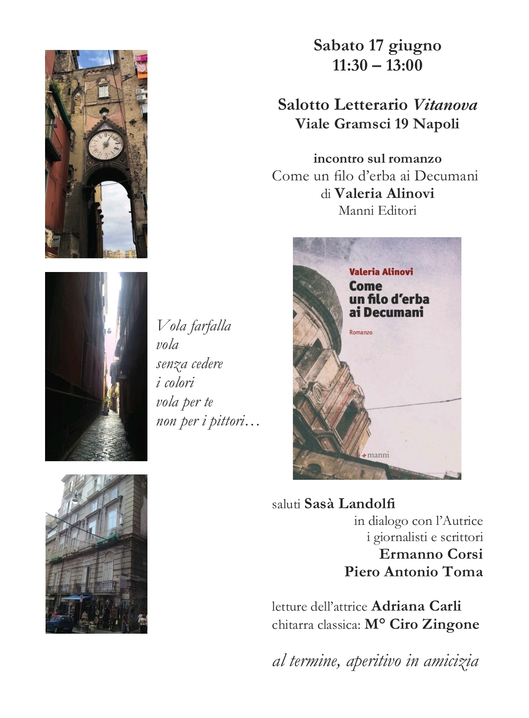 Sabato 17 Giugno 2023, alle ore 11:30 presso il salotto letterario Vitanova, viale Gramsci 19, Napoli, si terrà la presentazione del volume di Valeria Alinovi “Come un filo d’erba ai decumani” per Manni editore.