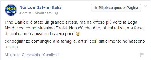 “Pino Daniele è stato un grande artista, ma ha offeso più volte la Lega Nord, così come Massimo Troisi. Non c’è che dire, ottimi artisti, ma forse di politica ne capivano davvero poco. Condoglianze comunque alla famiglia, artisti così difficilmente ne nascono ancora“.