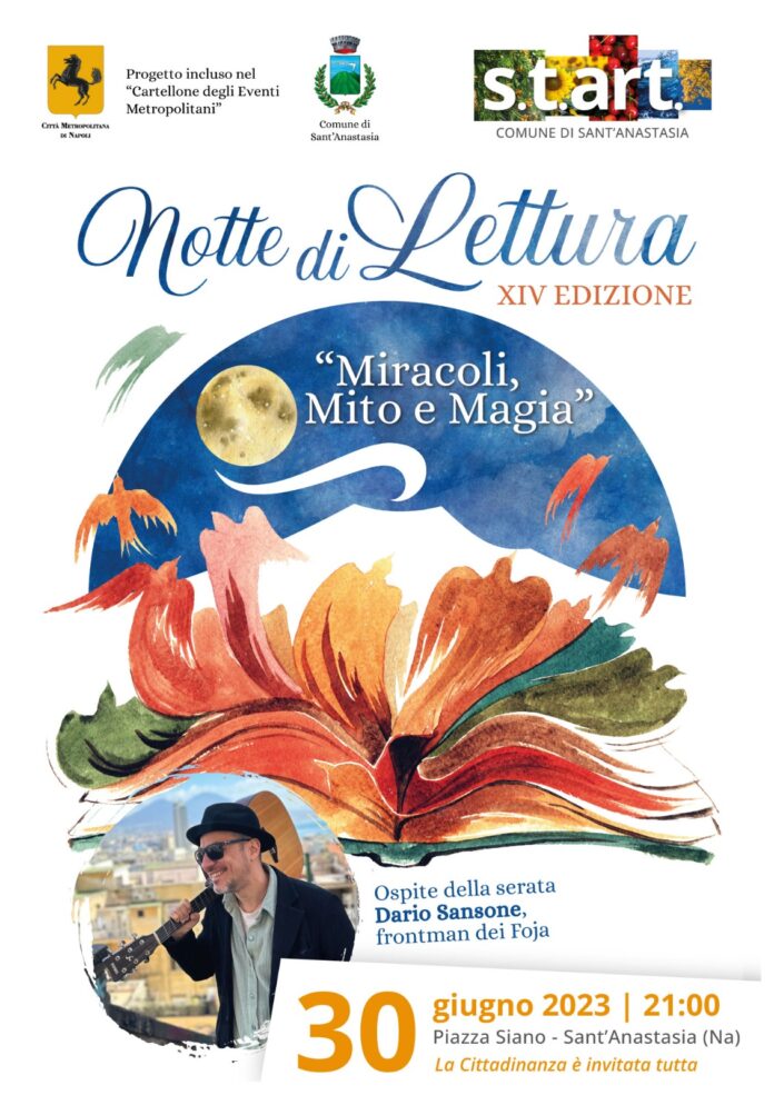 Continua il progetto S.T.ART (Sant’Anastasia Tour Art) con un nuovo evento, previsto per le 21.00 di venerdì 30 giugno in Piazza Siano: la XIV edizione della “Notte di Lettura”. Cittadini, amministratori comunali e ospiti speciali si cimenteranno nella lettura di brani letterari incentrati sul tema scelto per questa edizione, “Miracoli, Mito e Magia”.