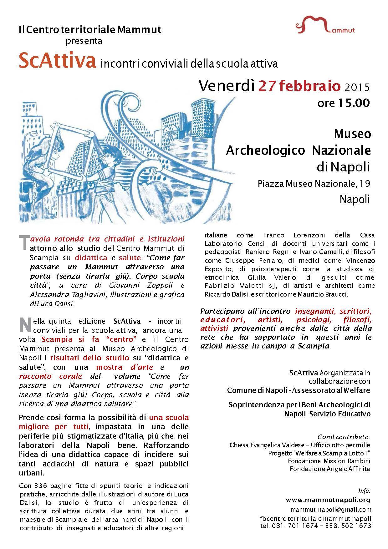 Per la V edizione di ScAttiva, occasione di incontro sulla scuola, la tavola rotonda tra cittadini e istituzioni verterà attorno allo studio del Centro Mammut su didattica e salute raccontato nel volume: “Come far passare un Mammut attraverso una porta (senza tirarla giù). Corpo, scuola e città alla ricerca di una didattica salutare” a cura di Giovanni Zoppoli e Alessandra Tagliavini con illustrazioni e grafica di Luca Dalisi, frutto della scrittura collettiva che ha coinvolto insegnanti, educatori, genitori, scrittori, medici, pedagogisti, psicologi, attivisti. L’incontro sarà arricchito da una mostra d’arte che è parte del lavoro di scrittura collettiva, al pari del libro, con opere in carta, rame, legno e altri materiali poveri frutto anche dell’incontro dei bambini con Riccardo Dalisi, di cui sarà esposta in anteprima anche la‘porta Universo’opera nata dal intreccio con il Mito del Mammut VII, tale opera sarà poi donata e istallata permanentemente a Scampia. Insieme ad essa, alla mostra, ci saranno le opere frutto dei primi passi per la creazione di un Museo del Bambini a Scampia per tutta la città.