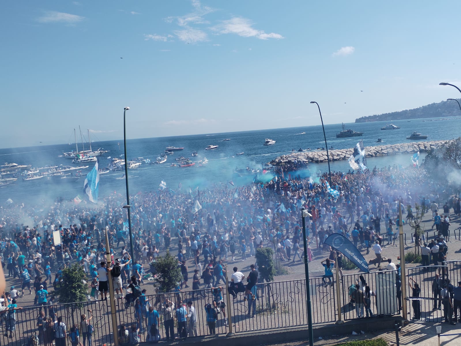 Lungomare di Napoli trasformato in un fiume umano di tifosi. Aperti i varchi questa mattina, in quasi duecentomila sono entrati in vista della parata dei bus che hanno trasportato i giocatori azzurri per celebrare la vittoria dello scudetto. Bandiere, cori, striscioni hanno fatto da scenografia alla marea di tifosi dal lungomare Caracciolo fino a Piazza Vittoria.