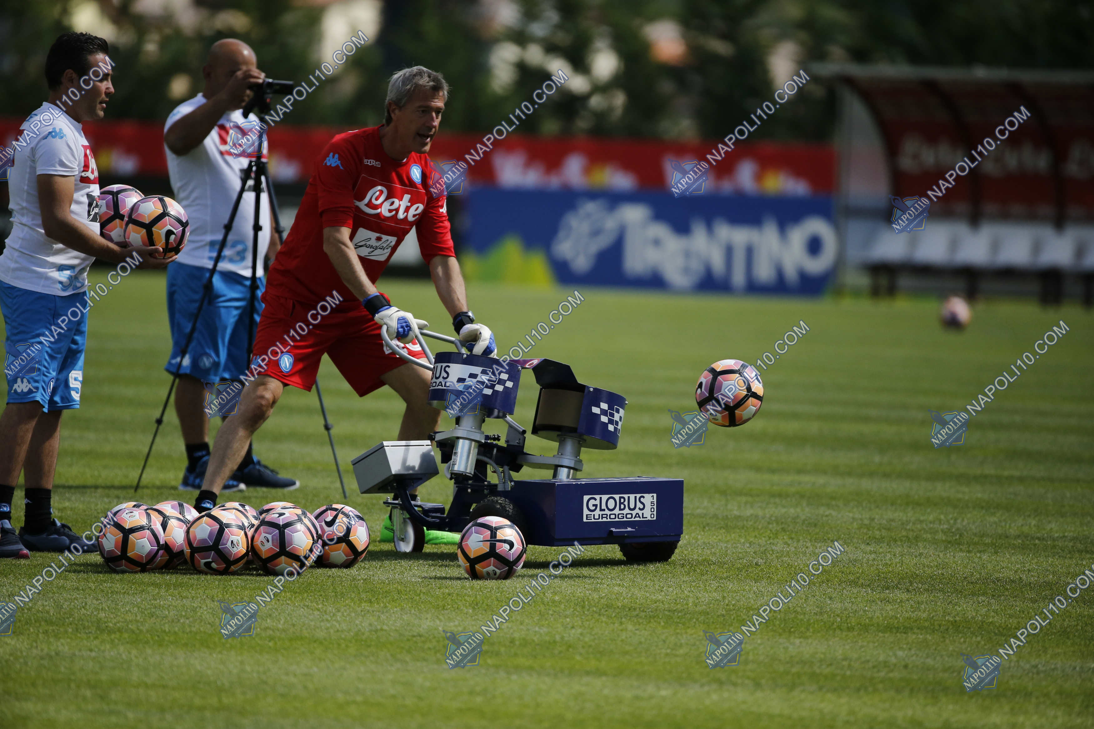 il preparatore dei portieri Alessandro Nista con la macchina sparapalloni durante il ritiro precampionato del SSC Napoli a dimaro 15 luglio 2016