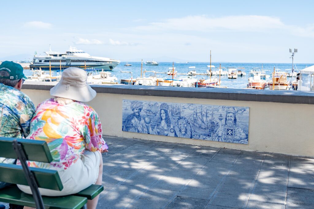 Torri grifagne poste a protezione dei tratti di costa dalle incursioni nemiche, mercanti che assistono alle operazioni di carico delle galee su cui viaggiavano spezie, stoffe e broccati. E poi ancora il miracolo di Sant’Andrea, che agitando il mare scacciò le navi del pirata saraceno Ariadeno Barbarossa, il mito delle sirene che qui tentarono di ammaliare Ulisse e quei volti di donne e di uomini nelle rotte tra Oriente ed Occidente.