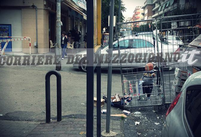 Un bimbo è intento a giocare in una gabbia di ferro di quelle utilizzate da un vicino supermercato per smistare i cartoni. Il piccolo, come si può vedere dalla foto di Dario Gaipa del Corriere del Mezzogiorno, ha circa due anni. La madre è poco più avanti, intenta a chiedere l’elemosina.