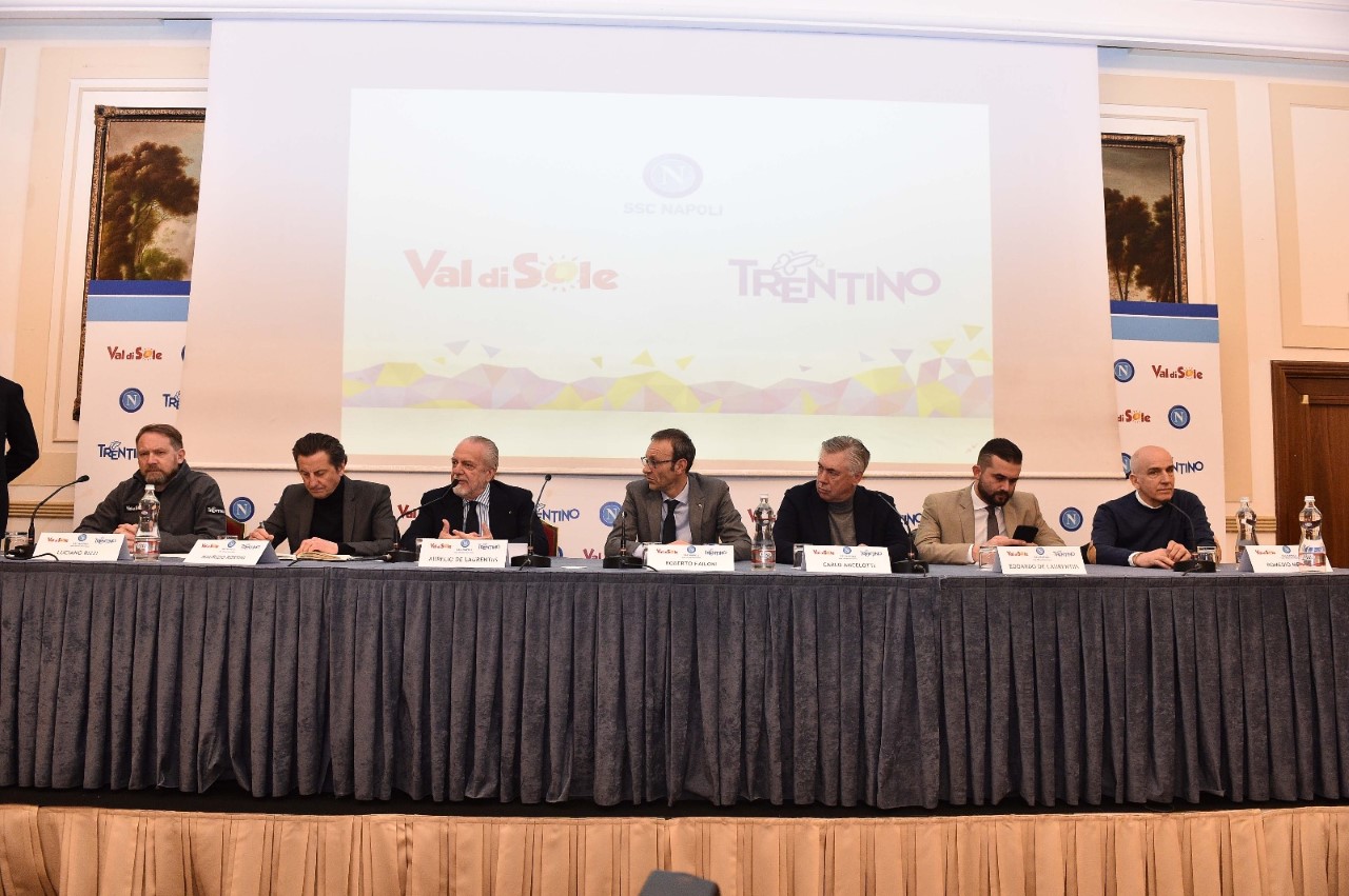 A presentare la novità al Grande Albergo Vesuvio sono stati oggi De Laurentiis con Carlo Ancelotti e il vicepresidente Edoardo De Laurentiis, l’assessore al Turismo Roberto Failoni, il Ceo di Trentino Marketing Maurizio Rossini, il presidente dell’Apt Val di Sole Luciano Rizzi e Romedio Menghini per il Comune di Dimaro Folgarida. In sala un centinaio di giornalisti delle varie testate e decine tra Tv e Radio.