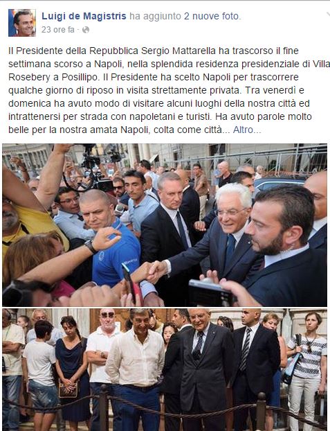 “Il Presidente della Repubblica Sergio Mattarella ha trascorso il fine settimana scorso a Napoli, nella splendida residenza presidenziale di Villa Rosebery a Posillipo. Il Presidente ha scelto Napoli per trascorrere qualche giorno di riposo in visita strettamente privata. Tra venerdì e domenica ha avuto modo di visitare alcuni luoghi della nostra città ed intrattenersi per strada con napoletani e turisti. Ha avuto parole molto belle per la nostra amata Napoli, colta come città meravigliosa e dalle enormi risorse. Sono molto grato al Presidente per queste semplici ma allo stesso tempo profonde espressioni che testimoniano quali siano i temi su cui soprattutto puntare per consolidare sempre più la riscossa della nostra comunità. Le bellezze di Napoli: uniche al mondo, che possono produrre benessere materiale ed interiore ai nostri abitanti. Le emozioni, fattore di ricchezza materiale e spirituale. Poi le infinite risorse della nostra città che, tutti insieme, dobbiamo cogliere ed utilizzare al meglio. Risorse da conservare, valorizzare, vivere, mai sfruttare e depredare. L’umanità, il calore e la passione dei napoletani che sono e saranno sempre più i protagonisti dell’immediato futuro della nostra città. L’orgoglio di appartenere alla nostra Terra. Una città che non si affida solo alla speranza, ma ha deciso di agire per riprendersi la dignità che merita e conquistarsi e costruirsi un futuro migliore. Il nostro PIL più forte e creativo non saranno certo le sole società per azioni del consumismo universale, ma soprattutto la nostra povera ma ricca SPA: Solo Per Amore. Gli azionisti della società della nostra comunità sono gli abitanti di Napoli che vivono in questa città che va amata profondamente, nelle cose belle da preservare e in quelle brutte da cambiare. Solo con la Giustizia, abbattendo disuguaglianze sociali ed economiche, realizzando opportunità di lavoro, stando vicino ai più deboli, rimanendo soprattutto umani, si possono costruire comunità migliori e più vivibili. Luoghi in cui non si perda la voglia di vivere. Napoli è una città che sa amare, sa tendere la mano ed abbracciare, sa lottare, e sa dimostrare tutto questo soprattutto nei momenti più difficili, di sofferenza, quando siamo chiamati alle armi del risveglio e quando davvero si misura la vera essenza di un essere umano“.