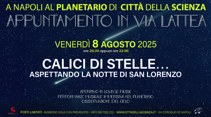 In occasione della magica notte di San Lorenzo, Città della Scienza invita il pubblico a una serata speciale per osservare il cielo e viaggiare attraverso l’universo. Venerdì 8 agosto, l’evento “Appuntamento in Via Lattea – Calici di Stelle… Aspettando la notte di San Lorenzo” offrirà un’esperienza unica sotto le stelle.