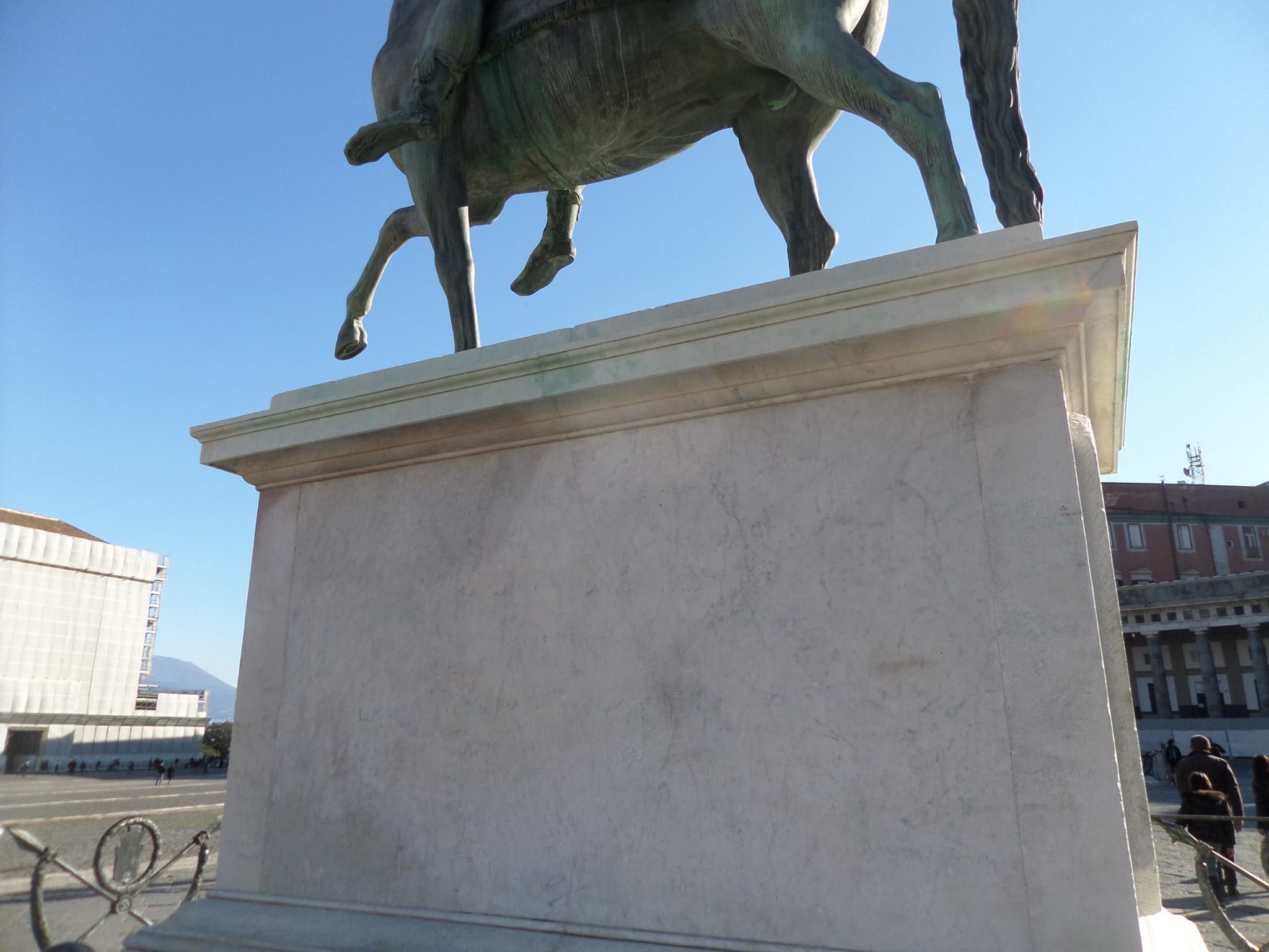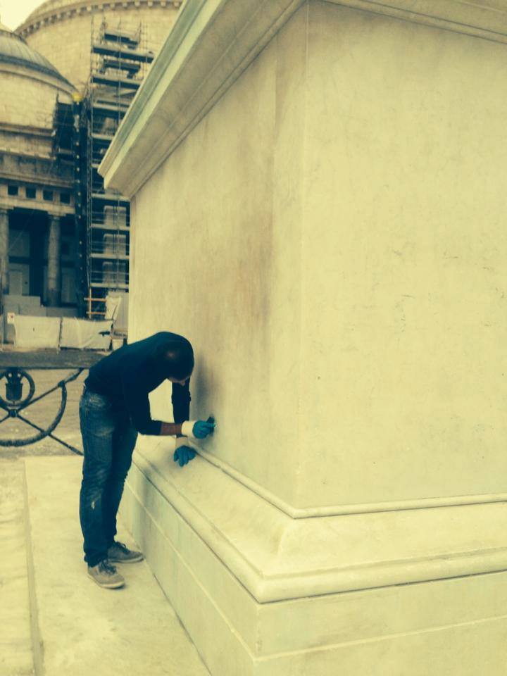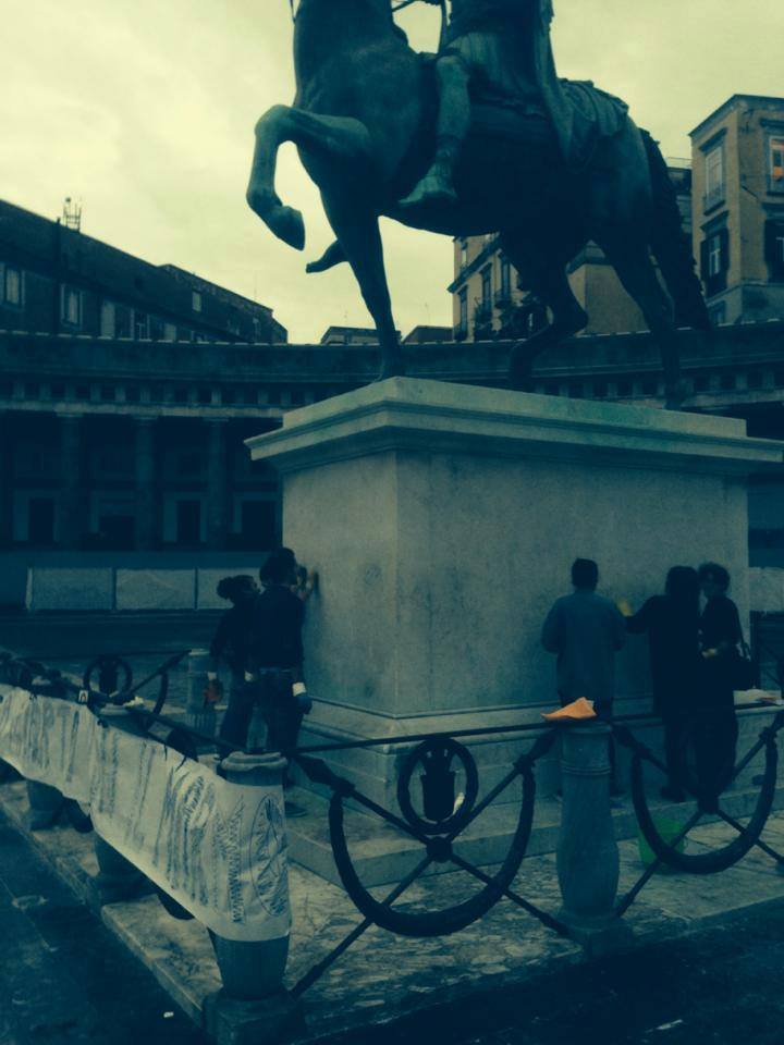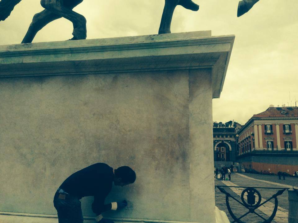 Ecco il messaggio che compare sulla bacheca della pagina Facebook di Sii Turista della tua Città: “A distanza di 1 anno e mezzo siamo scesi un’altra volta in piazza. Perchè? Le basi marmoree appena ripulite dal Comune con i fondi della Nutella sono state un’altra volta imbrattate con scritte. Abbiamo impiegato solo 2 ore e 30 per eliminare le scritte dalle basi marmoree e dai leoni. Noi Manifestiamo senza cortei, senza burdell’, noi crediamo che la più grande manifestazione sia dare l’esempio”. Questa ulteriore pulizia delle basi marmoree delle statue equestri della piazza continueranno ad essere pulite o dovremmo aspettarci nuovi atti vandalici?