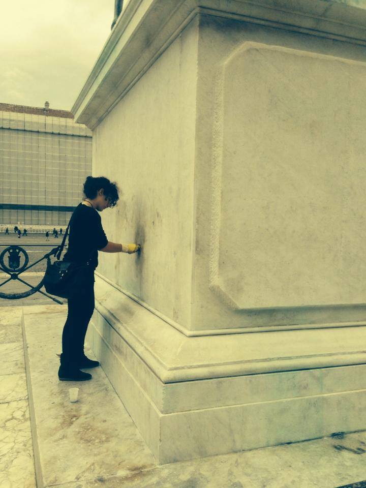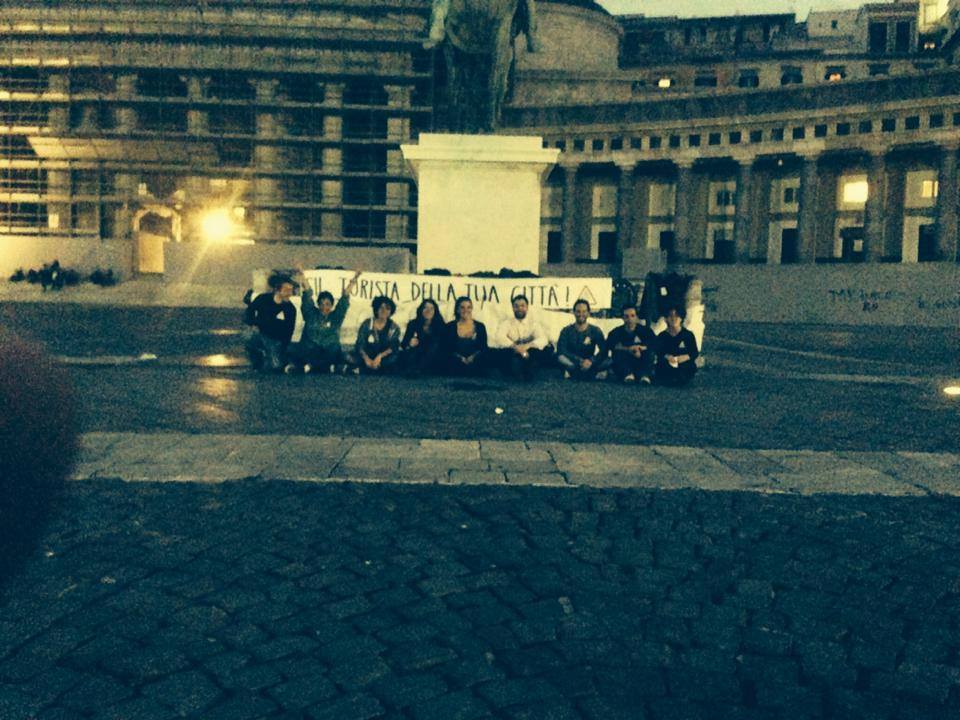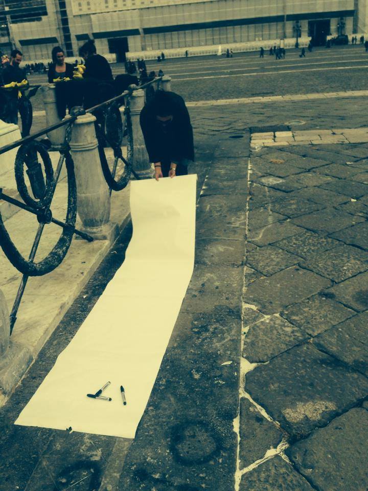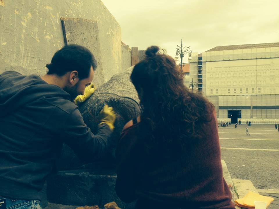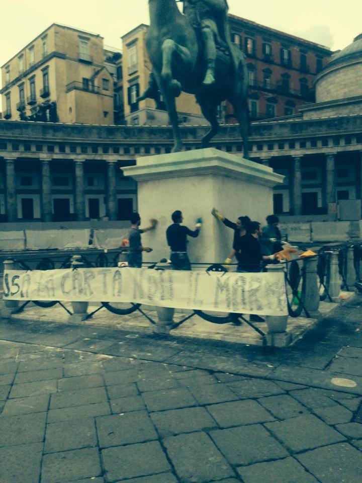 Ecco il messaggio che compare sulla bacheca della pagina Facebook di Sii Turista della tua Città: “A distanza di 1 anno e mezzo siamo scesi un’altra volta in piazza. Perchè? Le basi marmoree appena ripulite dal Comune con i fondi della Nutella sono state un’altra volta imbrattate con scritte. Abbiamo impiegato solo 2 ore e 30 per eliminare le scritte dalle basi marmoree e dai leoni. Noi Manifestiamo senza cortei, senza burdell’, noi crediamo che la più grande manifestazione sia dare l’esempio”. Questa ulteriore pulizia delle basi marmoree delle statue equestri della piazza continueranno ad essere pulite o dovremmo aspettarci nuovi atti vandalici?