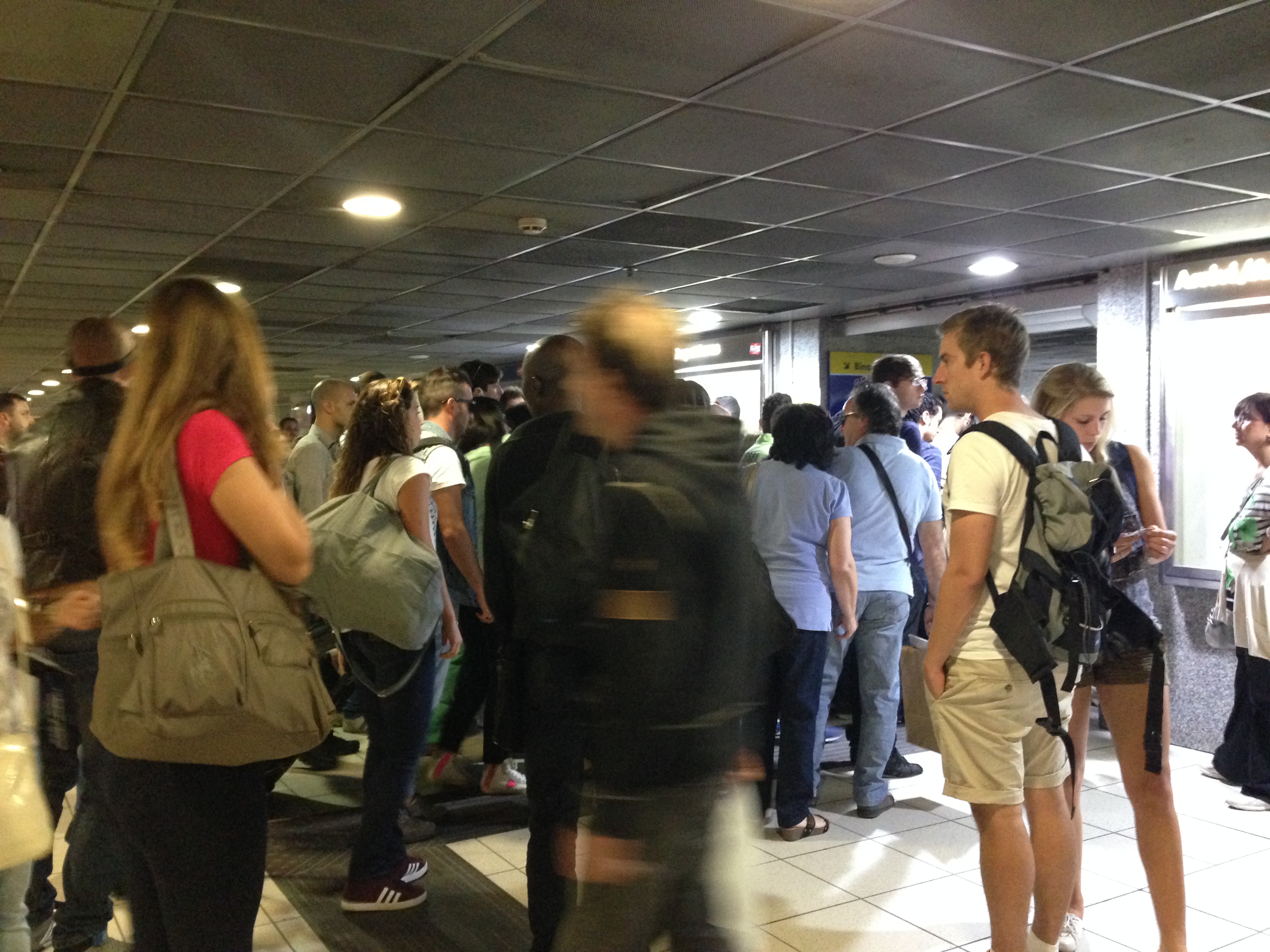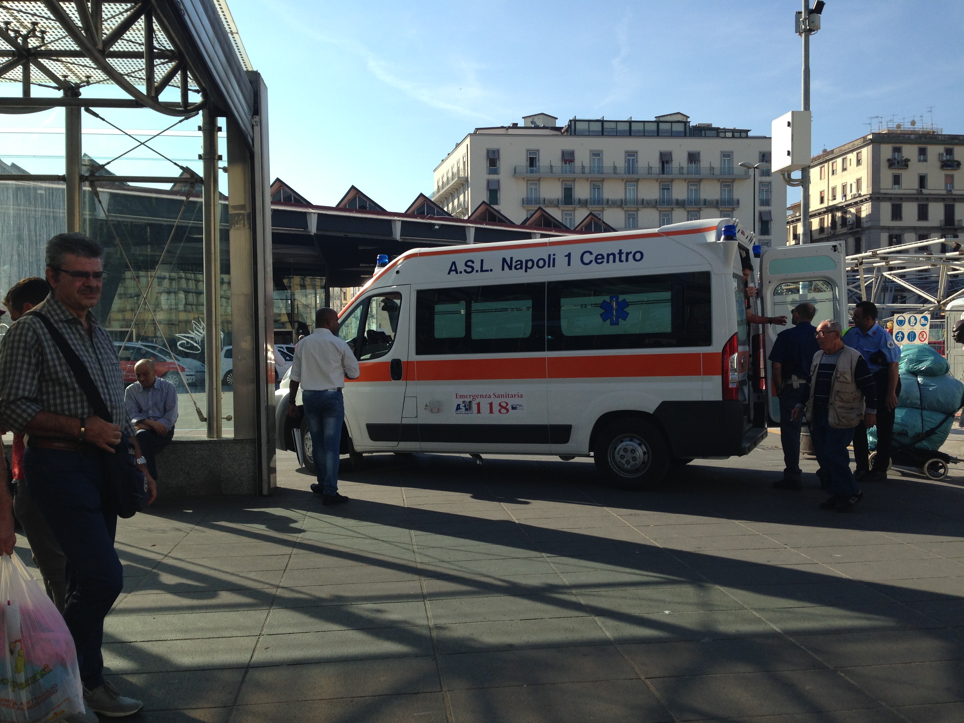A lungo l’ambulanza ha atteso all’esterno dell’ingresso della stazione, come si vede dalla foto. Intanto, qualche metro più in basso si è scatenata la ressa: la circolazione dei treni infatti è rimasta a lungo bloccata perché tutti i treni provenienti da Pozzuoli, non potendo fermarsi sul binario già occupato dal treno fermo in cui si trovava la donna, sono stati dirottati sull’altro binario, quello da cui solitamente partono i treni provenienti da Gianturco e diretti verso Pozzuoli. Risultato? Per oltre mezz’ora la metropolitana è stata inaccessibile.