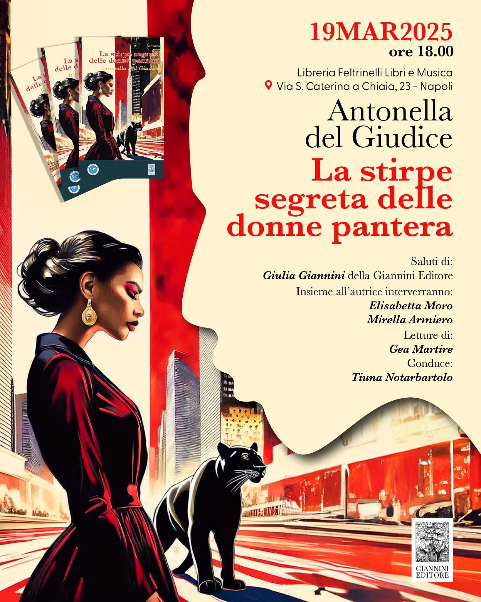 Ritorna in libreria Antonella Del Giudice con l’attesissimo romanzo “La stirpe delle donne pantera”, pubblicato dalla Giannini Editore nella collana “Romanzi dai cinque continenti”. La prima presentazione #evento si terrà mercoledì 19 marzo alle ore 18 presso la libreria Feltrinelli di via Santa Caterina da Siena ore 18. Dopo i saluti di Giulia Giannini della Giannini Editore, dialogheranno con l’autrice: Elisabetta Moro antropologa, Mirella Armiero giornalista. Le letture saranno a cura della nota attrice Gea Martire. Conduce la giornalista Tiuna Notarbartolo.
