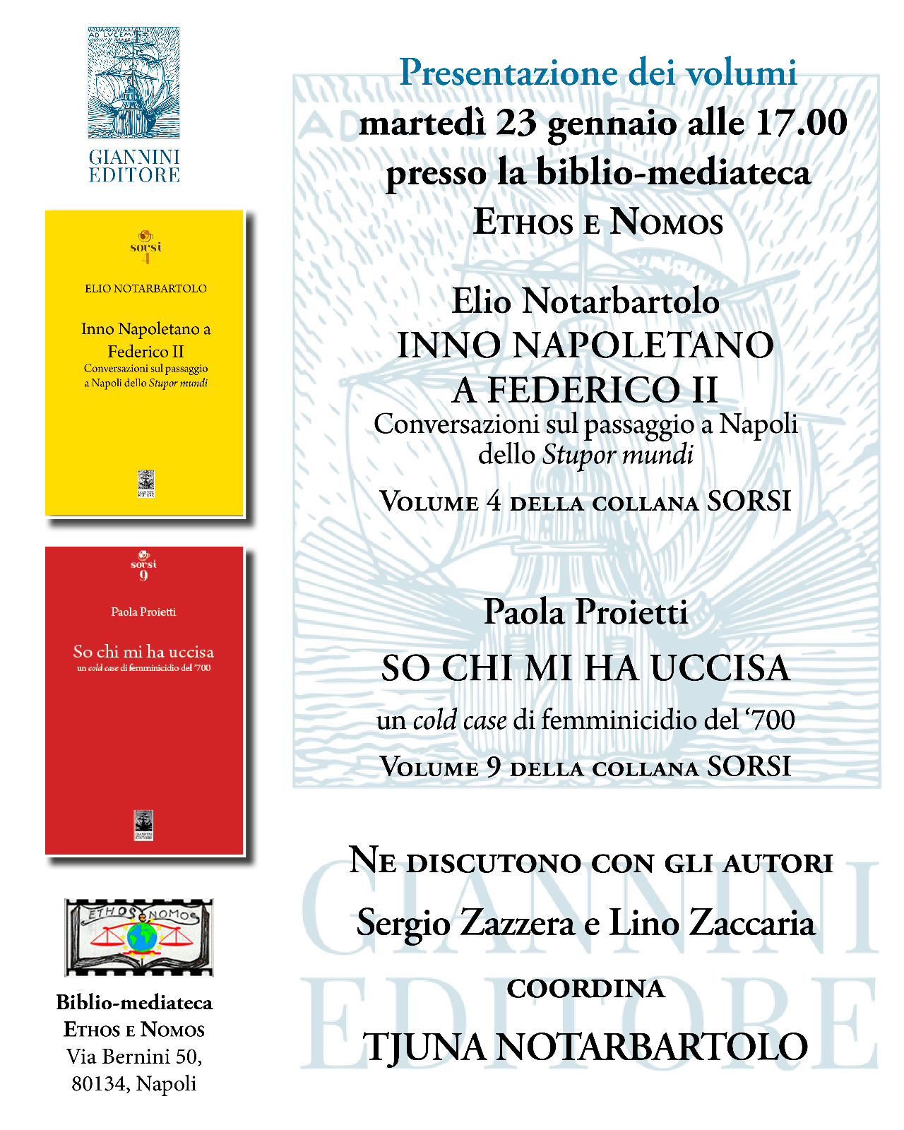 “Inno napoletano a Federico II” dell’ingegnere e giornalista Elio Notarbartolo e “So chi mi ha uccisa” dell’avvocato Paola Proietti, i due volumi che verranno presentati. Dialogheranno con gli autori il magistrato Sergio Zazzera e il giornalista Lino Zaccaria. Modererà la presentazione il direttore del Premio Elsa Morante Tiuna Notarbartolo.